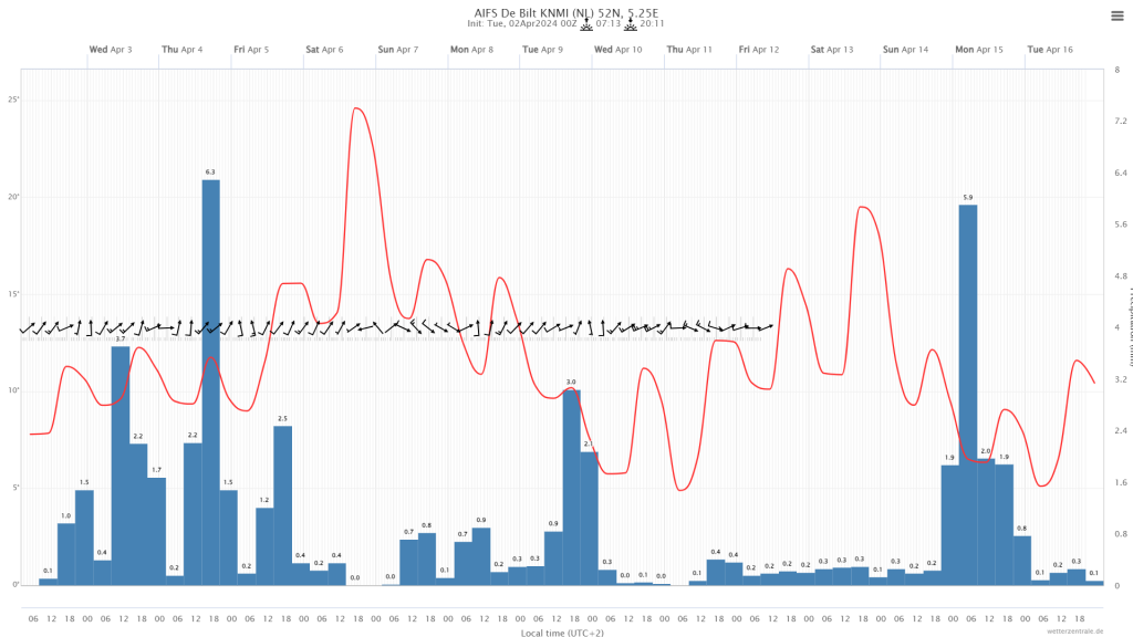 AIFS toont dit beeld. Ook maar 1 echt warme dag.