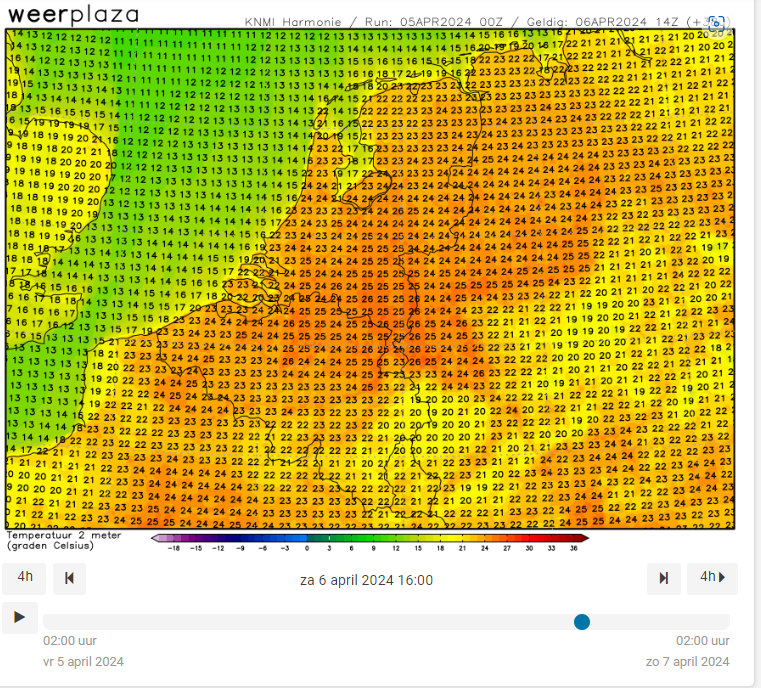 Maar met stadseffect is 25°C op veel plekken wel mogelijk denk ik. Geen zeewind morgen dus het westen doet lekker mee.