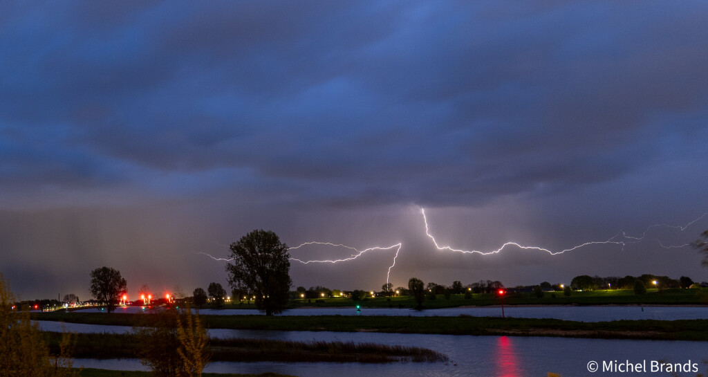 Dan gisteravond, maandagavond 15 april. Na de passage van het koufront vanmiddag was het hier in het midden van Nederland echt guur en was het een komen en gaan van buien met hagel, onweer en plaatselijk felle windstoten. 'Maartse buien' in april! Ik had dezelfde zomerjas aan als een week geleden, met daaronder nog een warm vest, maar ik stond nu echt te bibberen, bij een graad of vijf. Eerst op mijn balkon, maar toen ik zag dat de zwaarste buien iets zuidelijker trokken, ben ik even naar een bekende bliksem-foto's-maak-stek in het midden van Nederland gereden: onder de brug van de A27 (over de Lek) nabij Nieuwegein. Man, wat was het koud, zeker met die straffe wind uit het westen. Er waren toen ik aankwam nog maar weinig ontladingen te zien, maar toch slaagde ik er in eentje te maken van een bliksem aan de achterzijde van de bui, zichtbaar op de tweede foto. .
