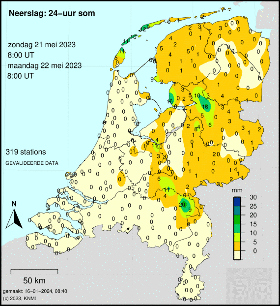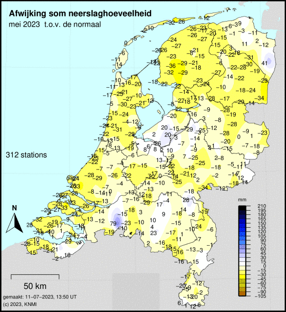 Volgens het KNMI was 22 mei zelfs nog wat natter met 4 mm. De maand als geheel kende ongeveer de normale hoeveelheid neerslag, 52 om 56 mm volgens de klimatologie (1991-2020).