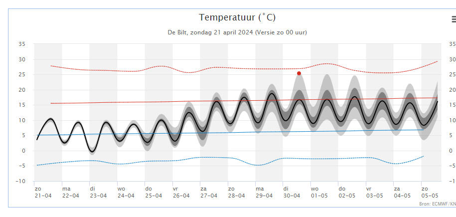 Daar lijkt het wel op. Want na maar liefst een dag of 11 onder de norm gaat deze pluim slechts naar het normaal voor de tijd van het jaar.