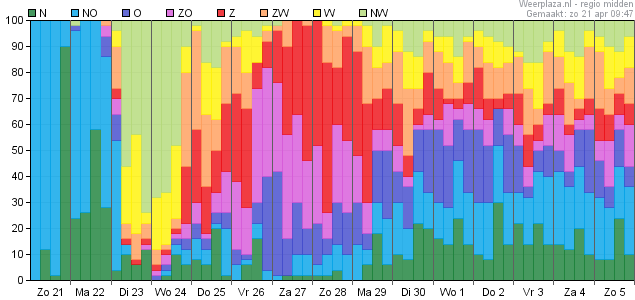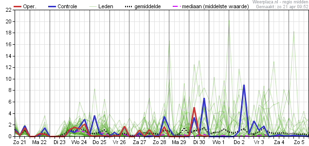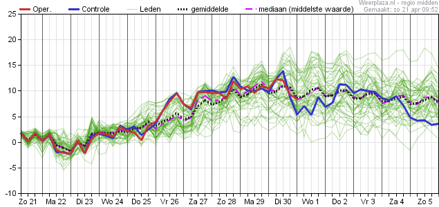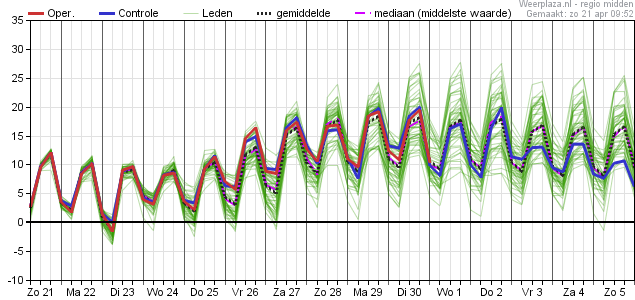 Vanaf komend weekend duidelijk hogere temperaturen en ook het dauwpunt gaat omhoog. Blijft wel dagelijks kans op een bui tot licht wisselvallig weer bestaan.