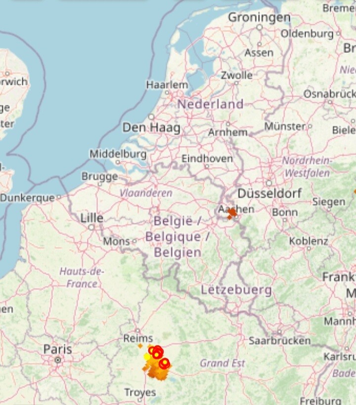 Vlakbij Reims onweer. Die buien zouden volgens AROME moeten uitgroeien tot een volledig onweerscomplex en in de nacht moeten overtrekken.