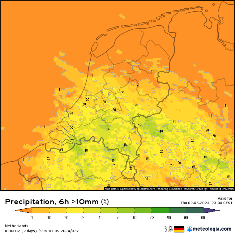 Het Duitse weermodel ICON-D2 komt in het zuiden van Nederland zeer lokaal met 80 - 100 mm in een uur tijd. Op basis van het ensemble lijken het zuiden van Nederland en het noorden van België de voorkeursgebieden te zijn.