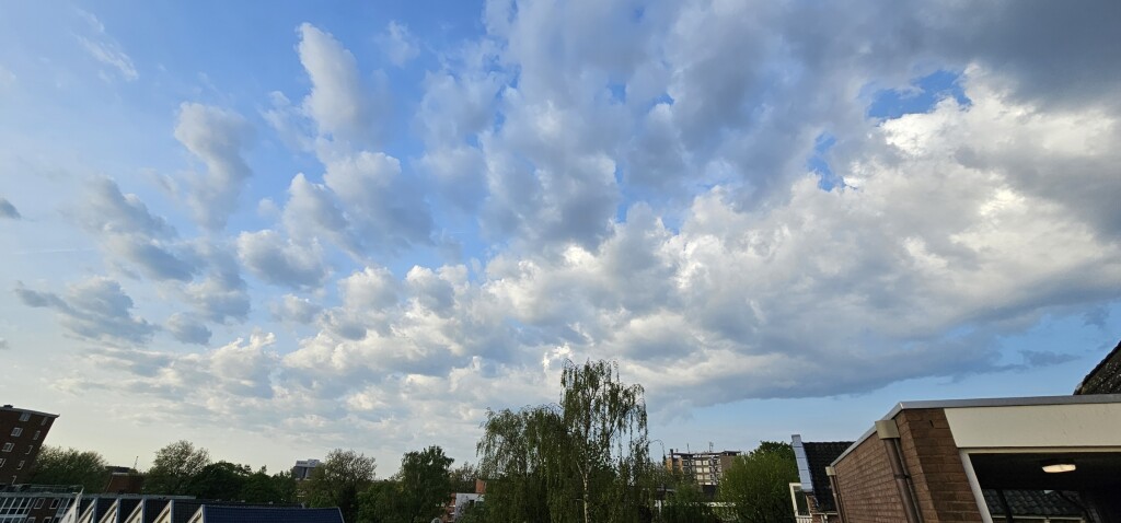 Ook hier stukjes boombladeren op de straten, door de hagelbui daalde de temperatuur kortstondig naar 9.6c, verder wel een klamme nacht geweest, nog wat scheerzeepjes van ongeveer een uur geleden, nu bijna onbewolkt en wat dauwerig
