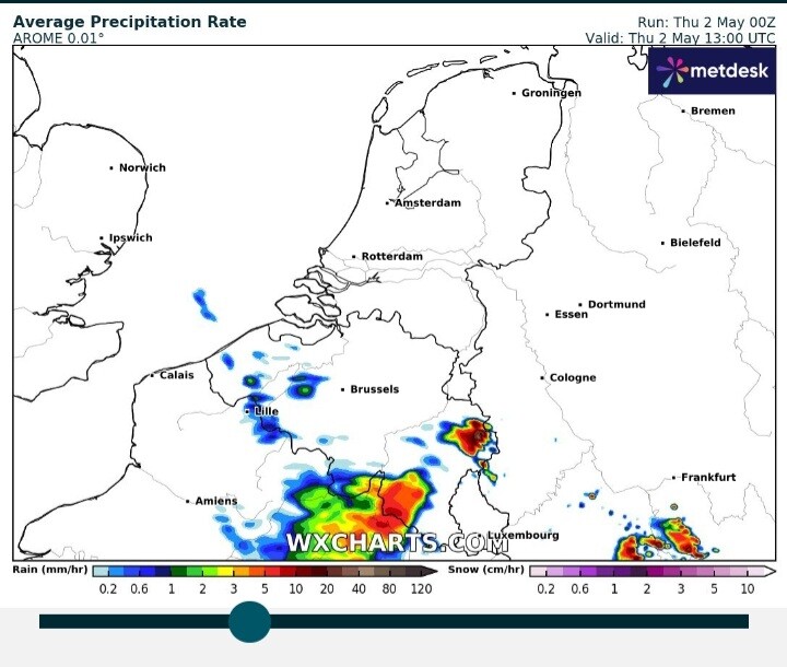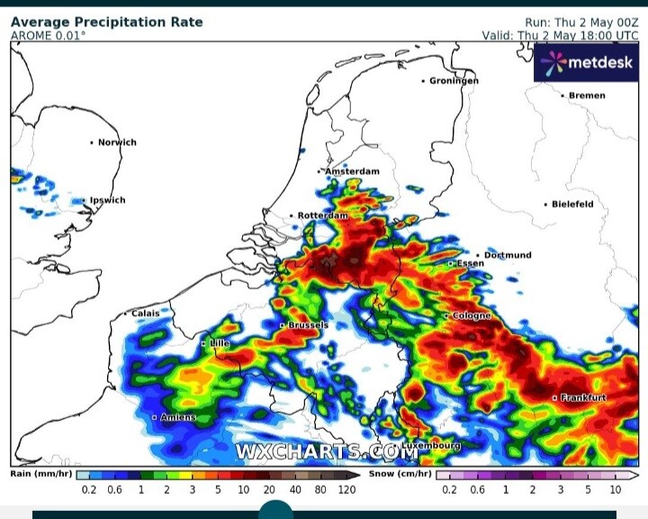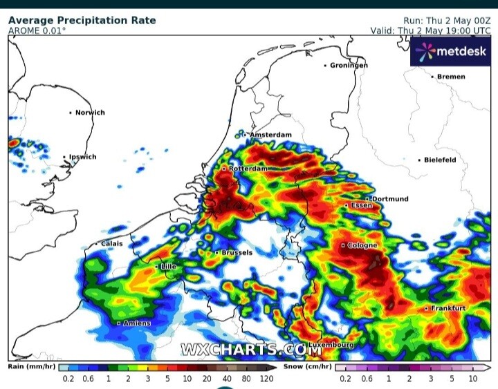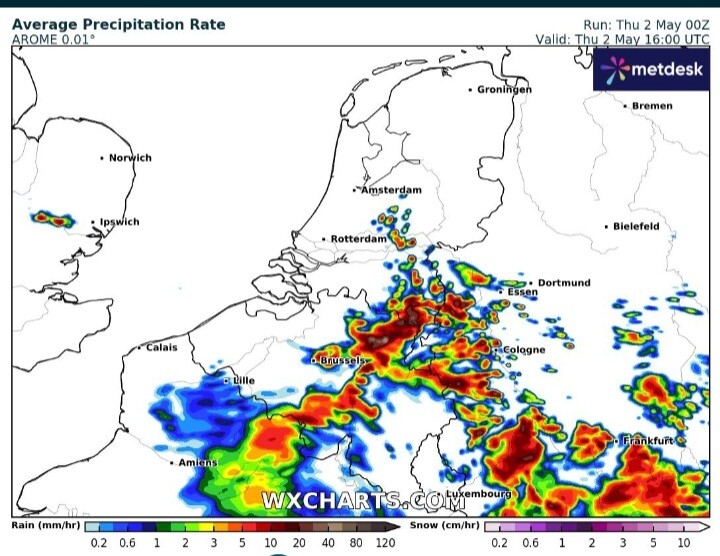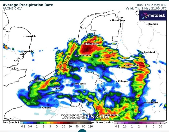 AROME nogal pittig met onweer, maar die zat er 2 dagen terug ook goed op met het onweer. Dus wie weet.