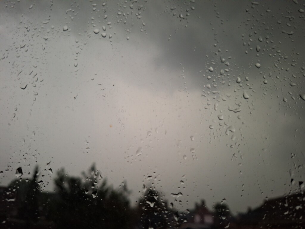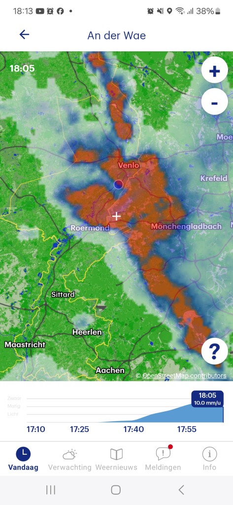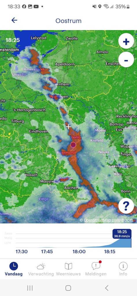 Het gaat behoorlijk los hier. Eerst groeiden de buien om mijn woonplaats heen wat er op de radar uitzag als een soort hoefijzervorm. Nu is het een behoorlijke lijn geworden.