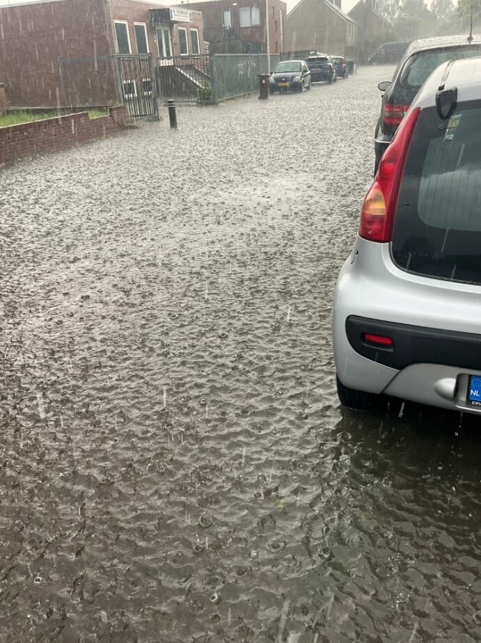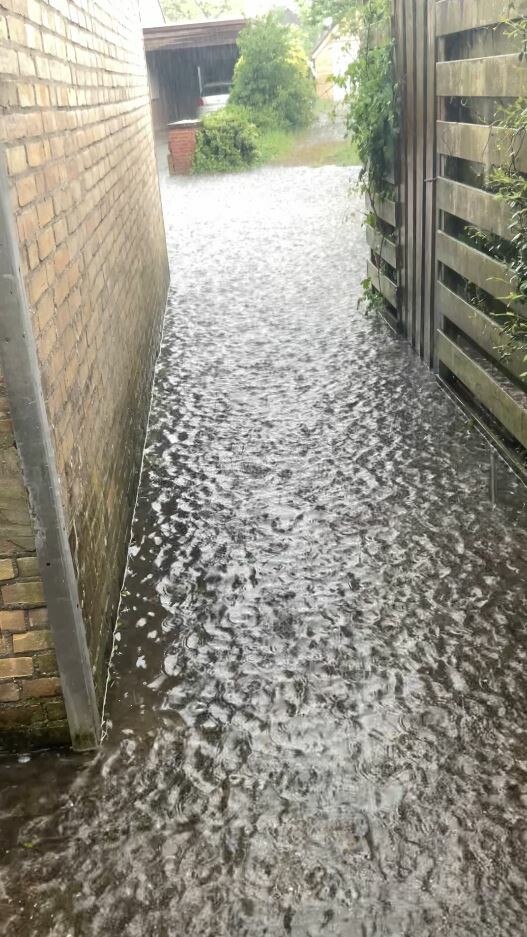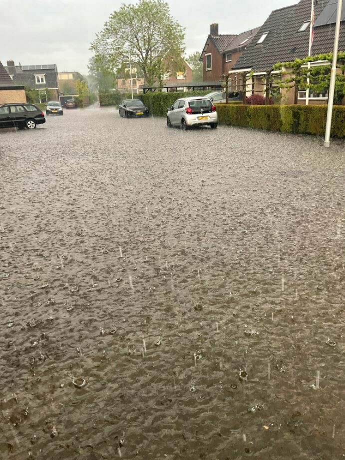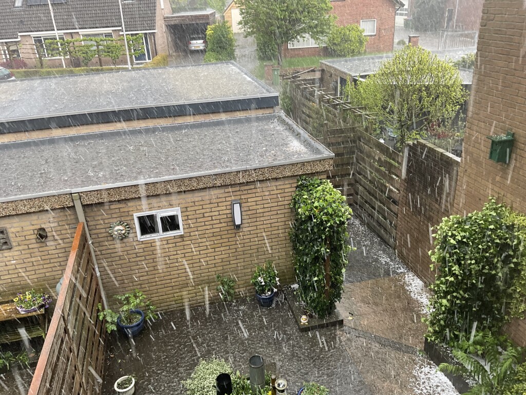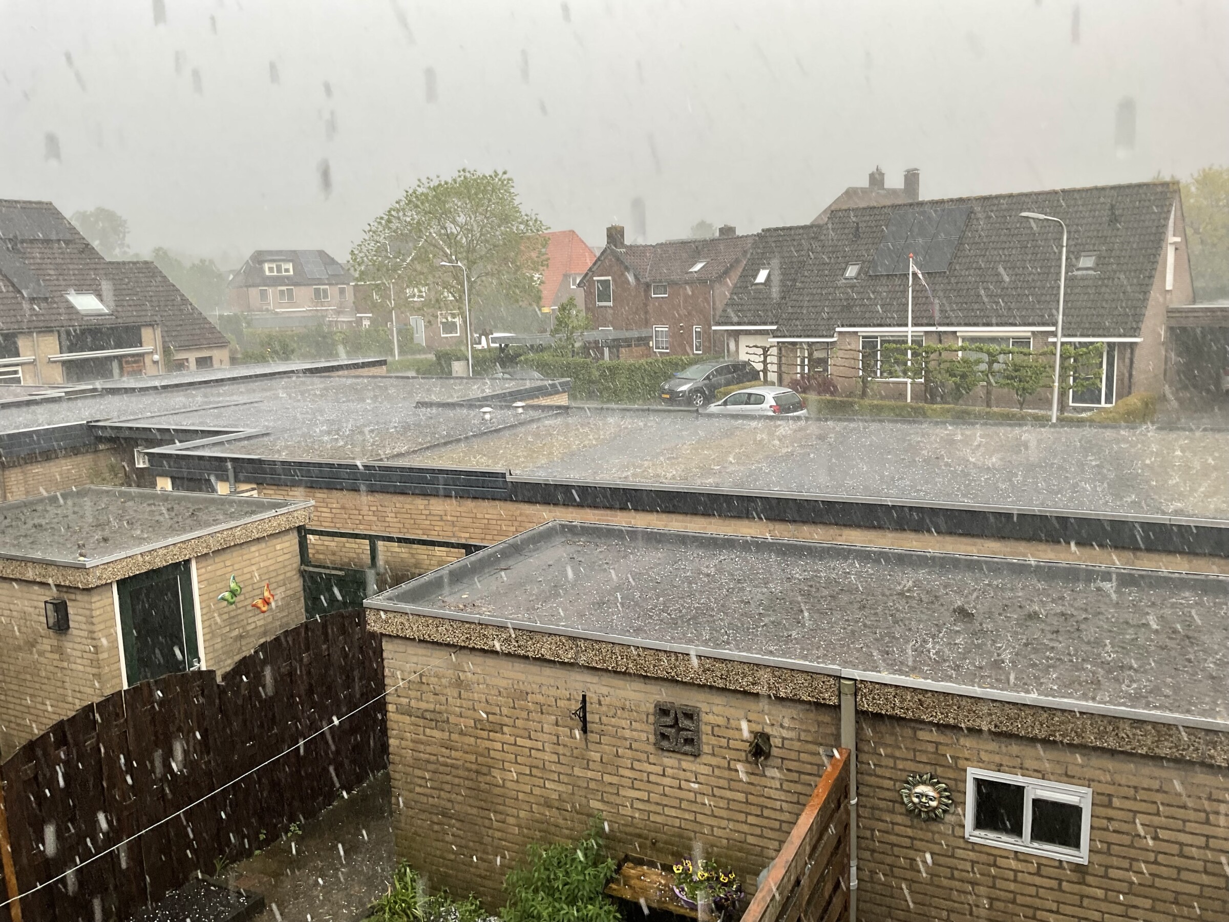 Hier wat foto's van de eerste onweersbui die hier tussen 18 en 20 uur passeerde met veel hagel. Die bui alleen al leverde 37,9 mm op (Hellmann).