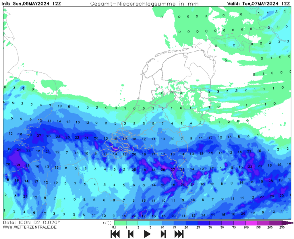 Het is iets dat me nu al maandenlang opvalt in de pluimen: voorspelde kleine neerslagpiekjes worden steeds hoger naarmate ze dichterbij komen. Morgen vanaf de namiddag dient zich weer zo'n voorbeeld aan: enkele dagen leek het er nog op dat de maandag slechts wat lichte buitjes zou opleveren, maar ondertussen wordt voor quasi geheel Vlaanderen en aansluitend Nederlands Noord-Brabant, Zeeland en Limburg weer een heuse regen-piek verwacht. Neerslaghoeveelheden die vlot over 20l gaan staan alweer in een behoorlijk groot gebied ingetekend zoals bv. in de laatste run van ICON D2.
