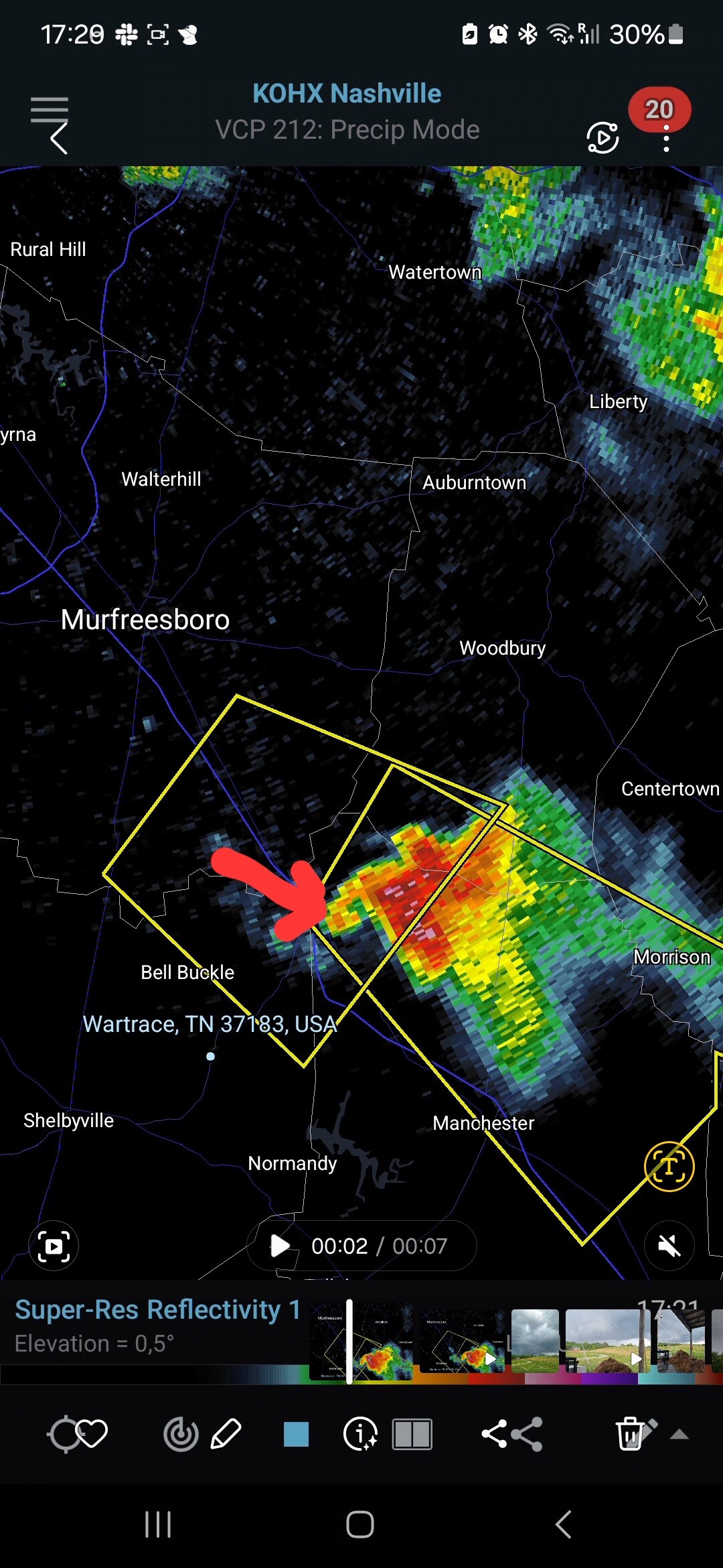Zag al een tornado warning daar. Zit zelf wat zuid westelijker dan Smithville in Beechgrove TN. Hier kwam een stuk lichter buitje langs. Zit precies bij het rode pijltje