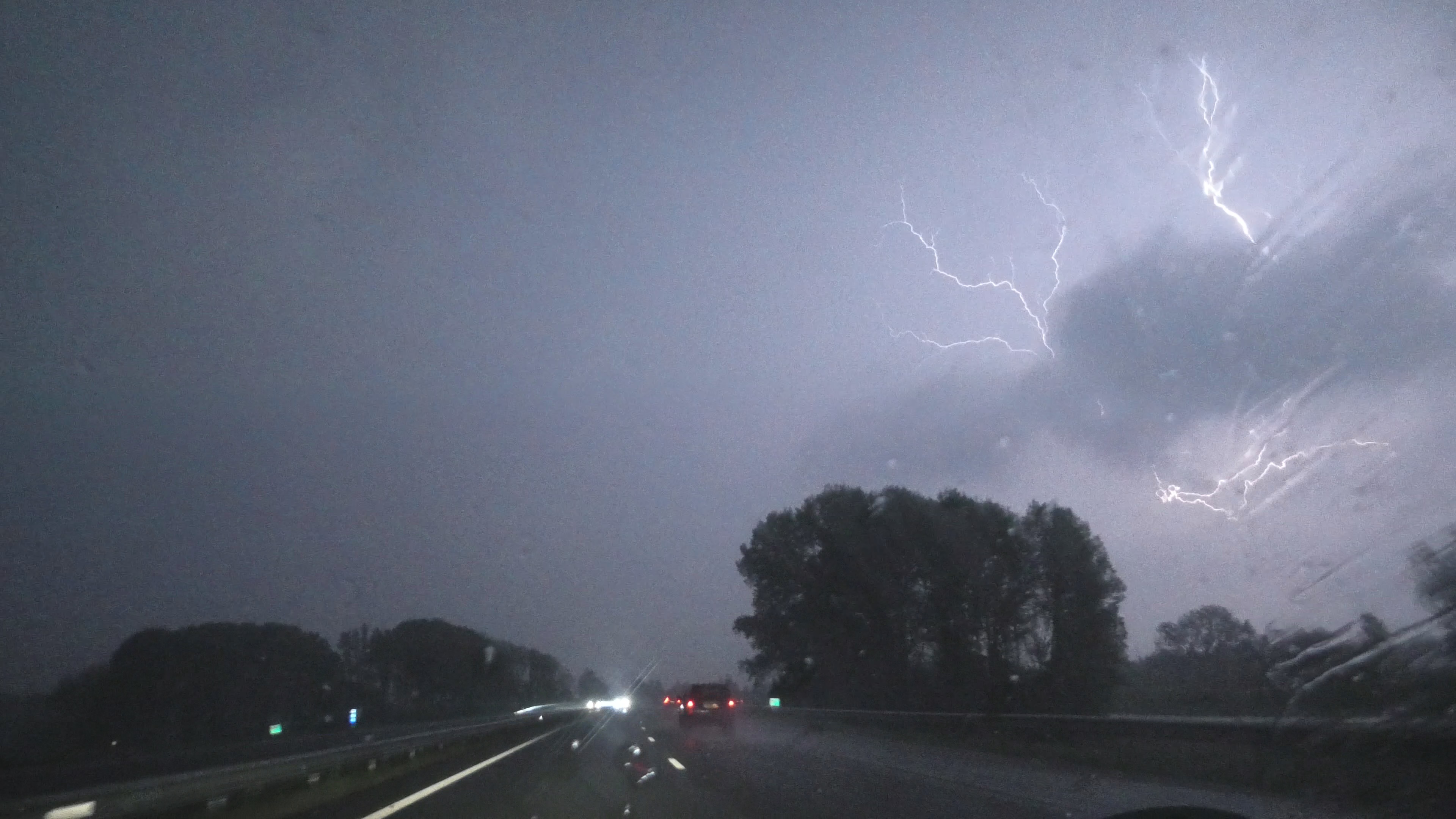 De buien trokken niet snel westwaarts waardoor wij op de A1 richting Barneveld weer een flinke wolkbreuk tegen kwamen. Hierbij waren er felle CG's af en toe te zien. Bij Barneveld troffen we een ander chase-team dat een compleet ander traject had afgelegd maar ook vele mooie buien gezien had. Het tankstation bij de Mac Donalds stond flink onder water.
