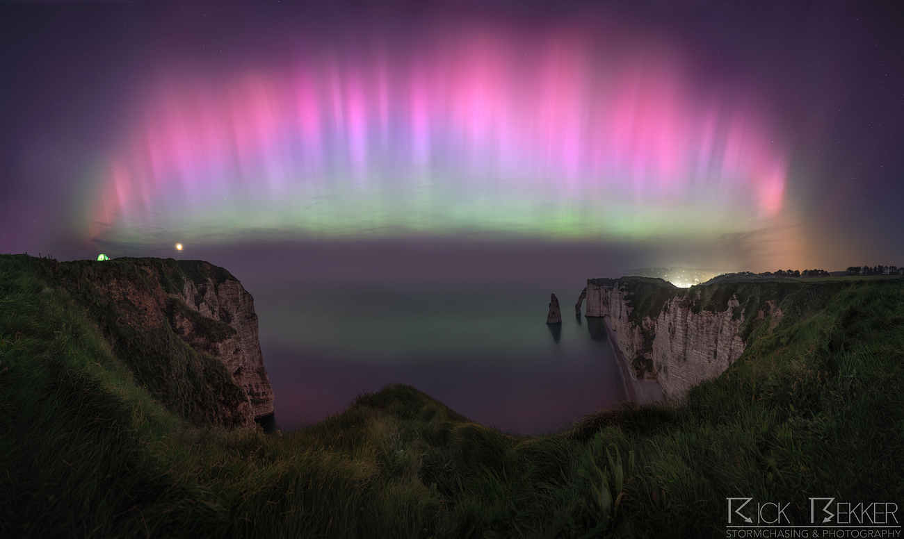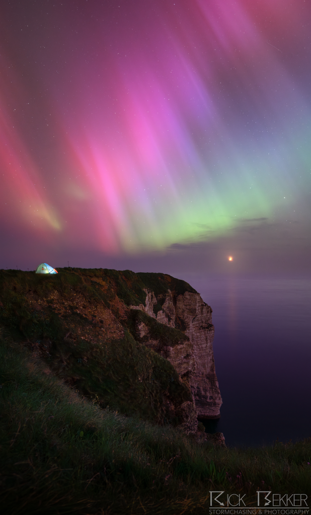 On-ge-kend. De sterkste zonnestorm sinds 2003 bracht een bizarre show van noorderlicht! Met een G5 watch, een volle KP9, BZ in de -50 en Hemisferisch vermogen van +370 gigawatt waren er totaal krankzinnige waardes in de atmosfeer aanwezig. Gezien het twijfelachtige beeld van de mogelijk storende bewolking boven Nederland zijn Gijs, Daphne ik en Calvin richting de Franse rotskust gereden. Een rit van een goede 5 uur om te ontsnappen aan de bewolking. En nu nagenieten en door de honderden foto's bladeren van deze bizarre nacht!