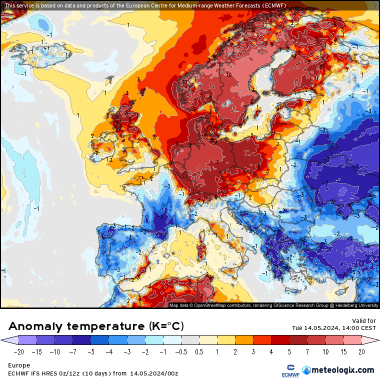 Centraal-Europa en Scandinavië zeer warm, in het zuiden en (zuid)oosten juist een stuk koeler.