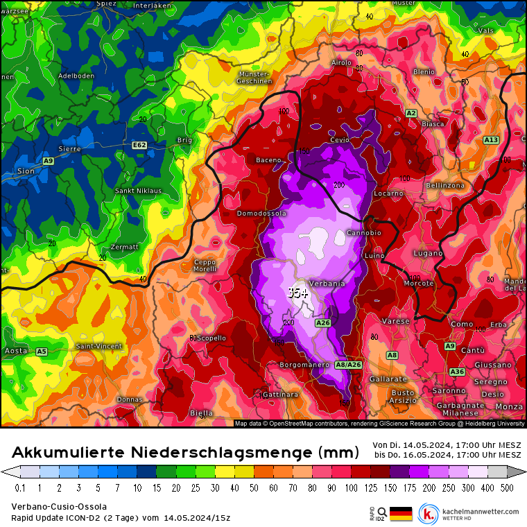 De komende 48 uur wordt er zeer veel regen verwacht in Noord-Italië. ICON komt zelfs met 350 mm rond het Lago Maggiore op de proppen. Ter vergelijking: in Nederland valt jaarlijks 850 mm. Maltempo dus, opgepast in het noorden.
