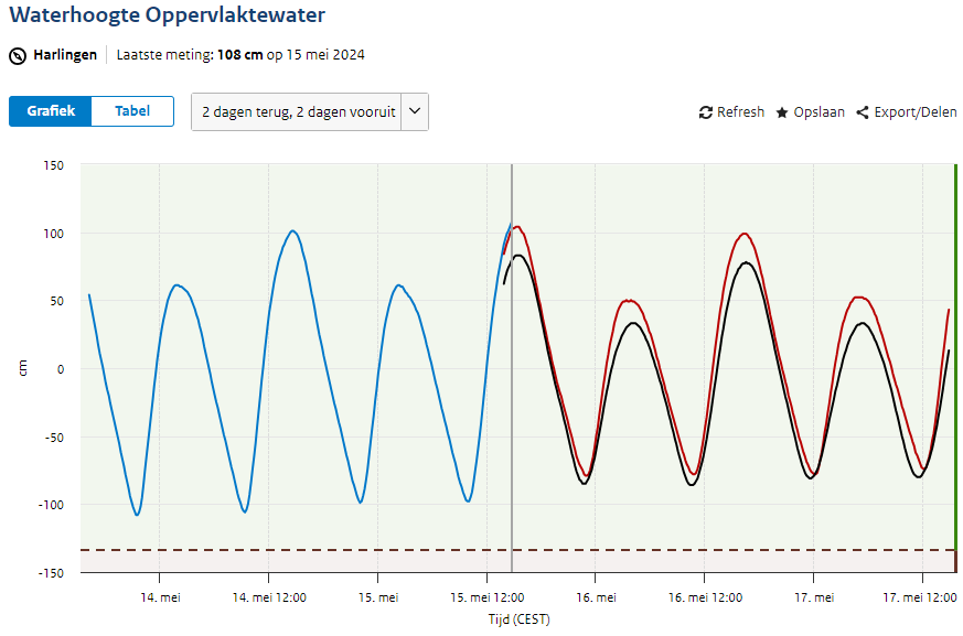 Het verschil tussen het astronomische getij (zwarte lijn) en het verwachte getij (rode lijn, inclusief windeffecten) is niet erg groot op dit moment. De verwachte waterstanden zijn zelfs iets hoger dan de waterstanden op basis van alleen het astronomische getij. Hoe anders was dat afgelopen oktober, toen daalde de waterstand door een stormachtige oostenwind tussen Denemarken en Schotland naar bijna NAP -3 meter in de Eemshaven!