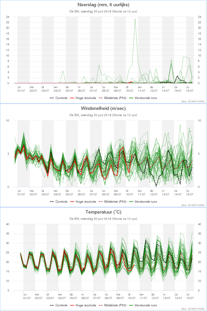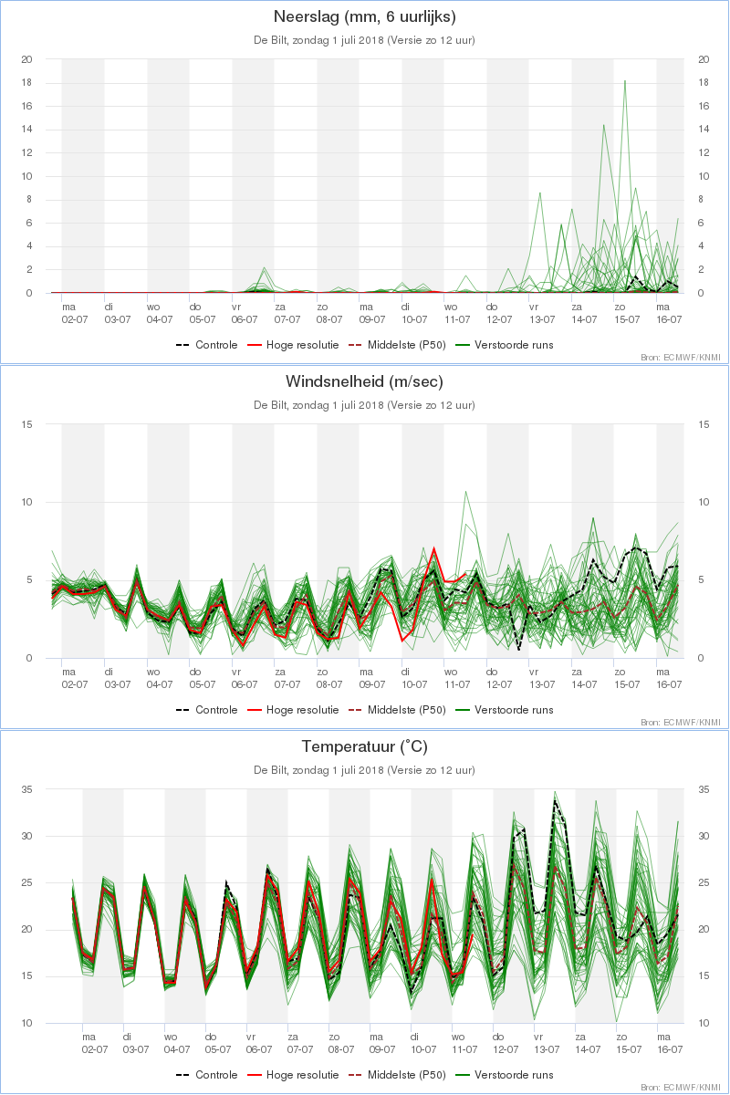 Die kwam heel aardig in de buurt van de nullijn, uiteindelijk viel er ook echt 0 mm tot 11 juli. Op deze laatstgenoemde dag viel er 1 schitterende mm die meteen de volledige maandsom bleek te zijn. Bovendien een thermisch zeer acceptabele pluim, met hier dagelijks zomerse waarden die vaak tegen de tropische 30C aanscheerden.