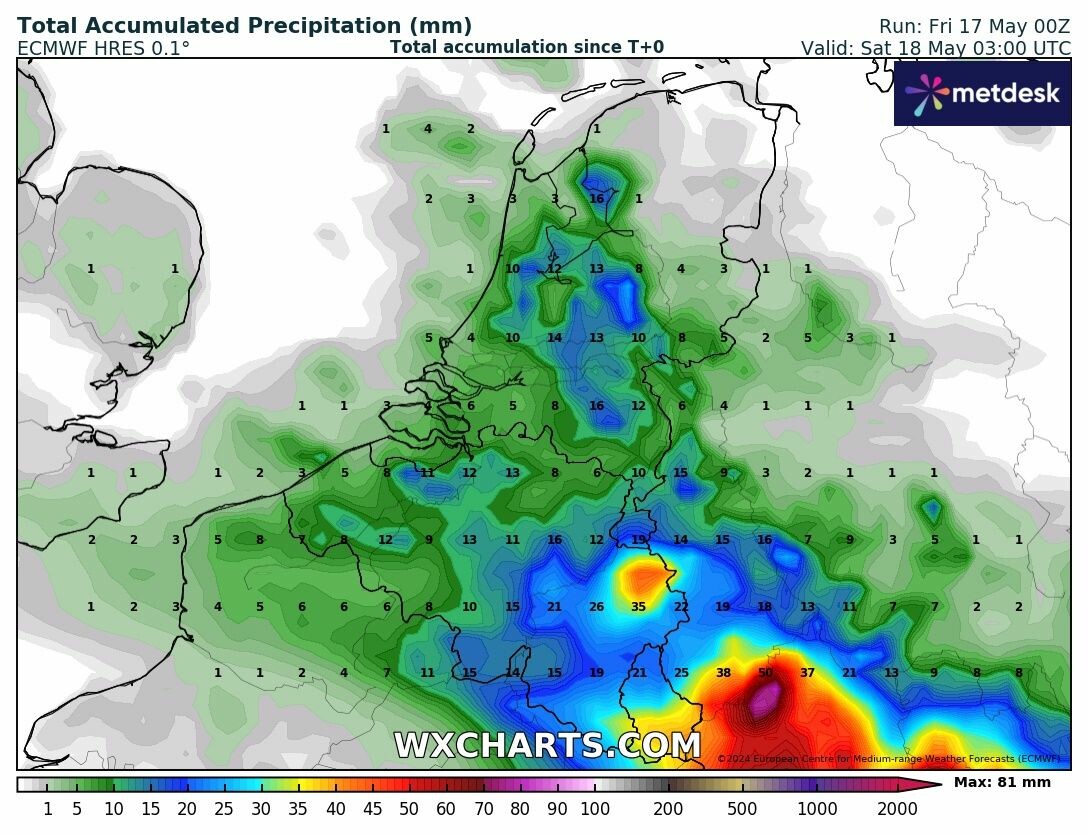 Vervolgens een strook met meer neerslag vanuit Limburg naar het noordwesten. Daarin zijn de modellen vrij eensgezind.