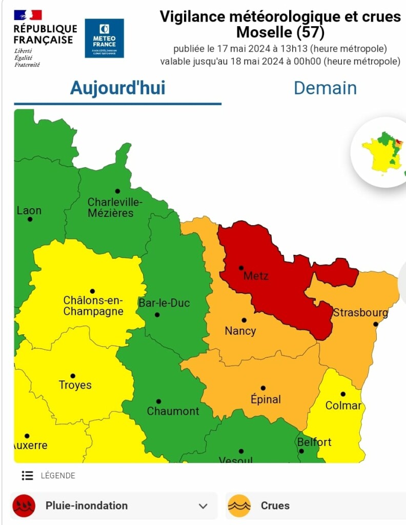 Er zouden al meldingen zijn van neerslagsommen boven de 100 mm in dit gebied, ten zuidoosten van Sarrebourg. En het gaat nog door! Melding via