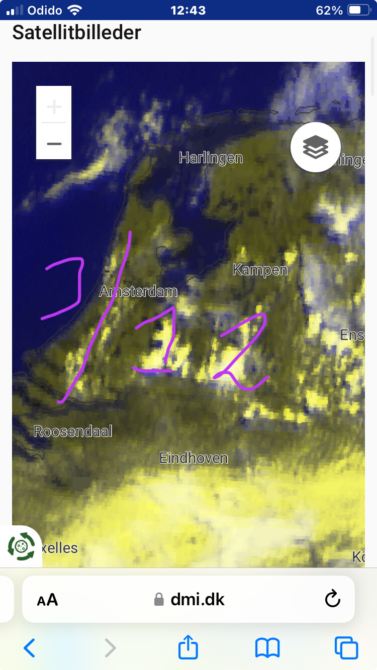 Wat extra forcering vanwege orografie en ruwheid van het oppervlak door begroeiing waardoor de Cu daar als eerst doorschieten en de buien met noordoostenwind nu aan de zuidkant ontstaan (bij 1 de Heuvelrug en bij 2 de Veluwe). Bij 3 mooi de Cu te zien op het zeewindfront. Komende uren in de zuidoostelijke helft op meer plaatsen buien als ook daar de buienbarriere wordt geslecht. Wageningen-NO uit dat buitje zojuist trouwens een krappe millimeter regen.