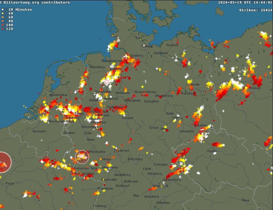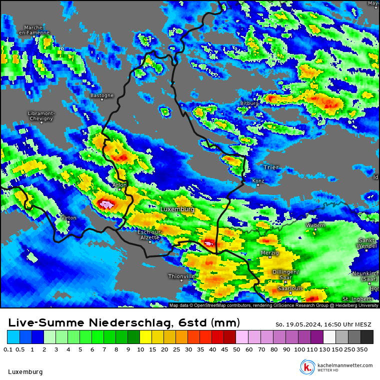 Wel is er ondertussen in en rond het zuiden van Luxemburg alweer plaatselijk tot ruim 50 mm gevallen (zie de tweede afbeelding), wat in geen enkele verwachting stond. Er waren wel berekeningen tot 35 mm, maar niemand nam dat over in een weerbericht.