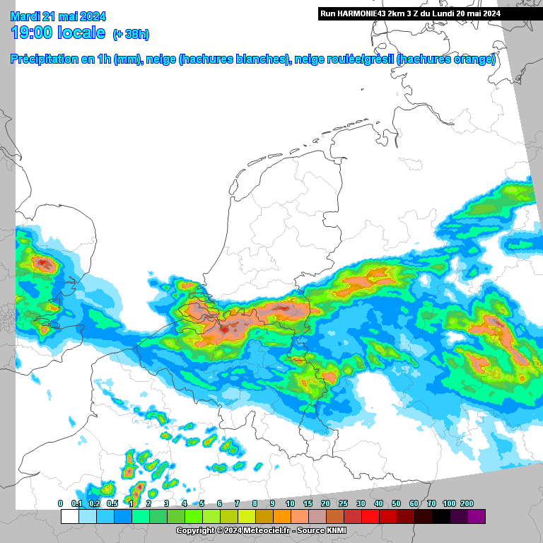 Vandaag vergelijkbare omstandigheden boven het noorden en westen als zondag boven het zuidoosten. Schering rond 15 kn, CAPE 1500-2000 J/kg. In het noorden en westen weer plaatselijk 20-40 mm. Forcering is waarschijnlijk convergentie in de grenslaag boven de kustprovincies in combinatie met PVA bij de hoogtetrog (vanuit het hoogtelaag NO-waarts georienteerd). Dinsdag tot ver in de middag droog, CAPE is dan iets hoger dan maandag, maar er is eerst nog geen forcering (zwakke rug op 500 hPa). Bij de thermische vore en met het cyclonaler worden van de bovenstroming fikse regen- en onweersbuien met kans op hagel. Verticale windschering neemt toe naar 25-30 kn, dus multicell clusters zijn waarschijnlijk. Uursommen rond 30 mm en 6-uursommen van lokaal 40-50 mm zijn mogelijk volgens alle Harmonies.