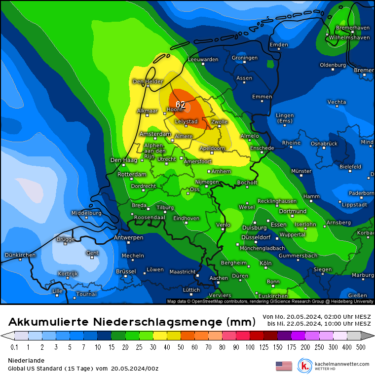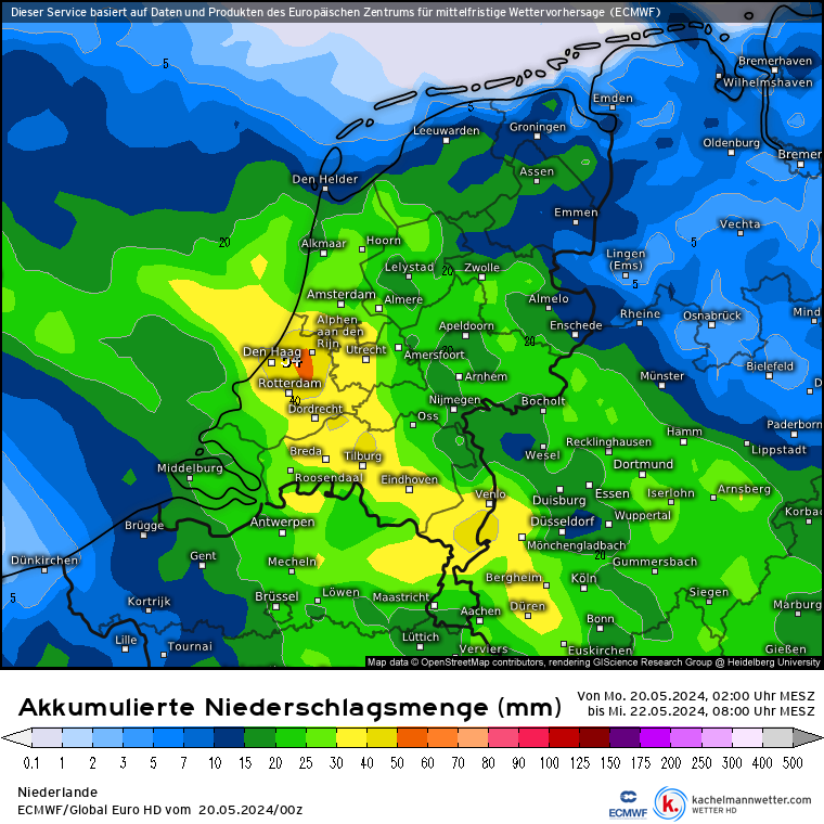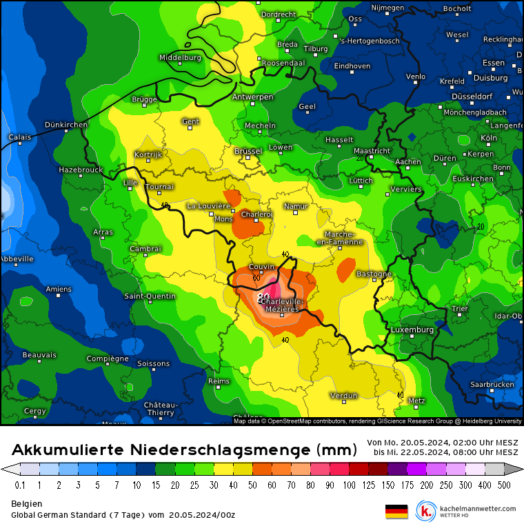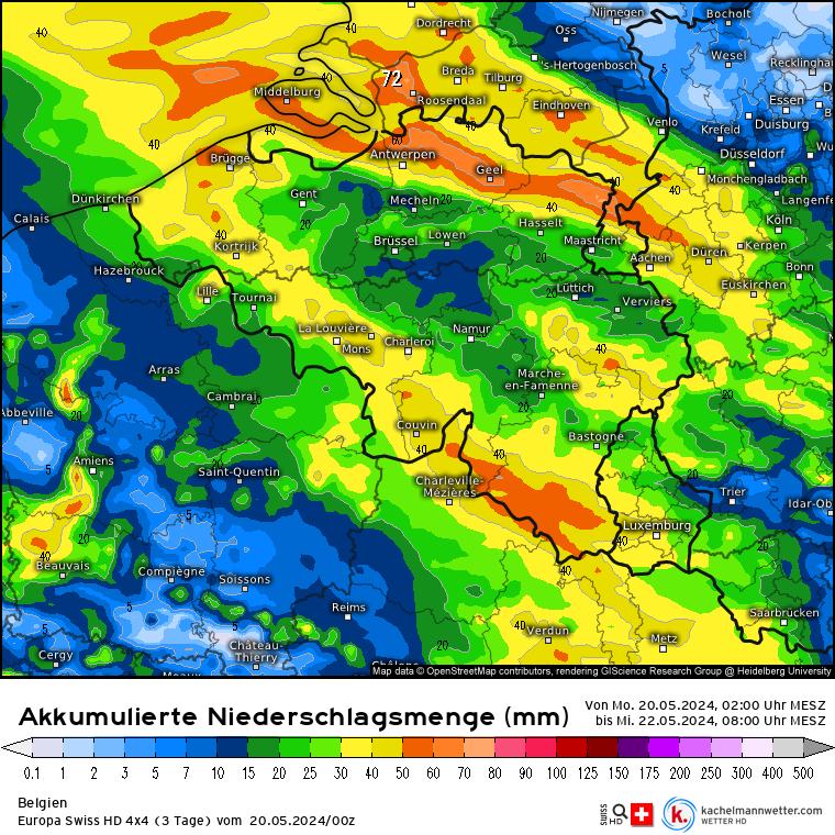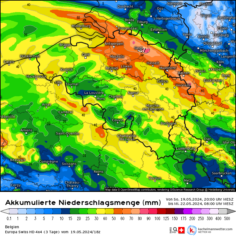 ICON heeft een forse neerslagpiek in het zuiden, bij de Franse grens. Swiss-HD heeft die iets minder, maar daarbij een groot gebied met meer dan 50 mm rond het noorden van Belgie - en ook de Voerstreek en omgeving. Ec en GFS geven de meeste neerslag nog noordelijker, in Nederland. En dat dus op een termijn van niet veel meer dan 48 uur.
