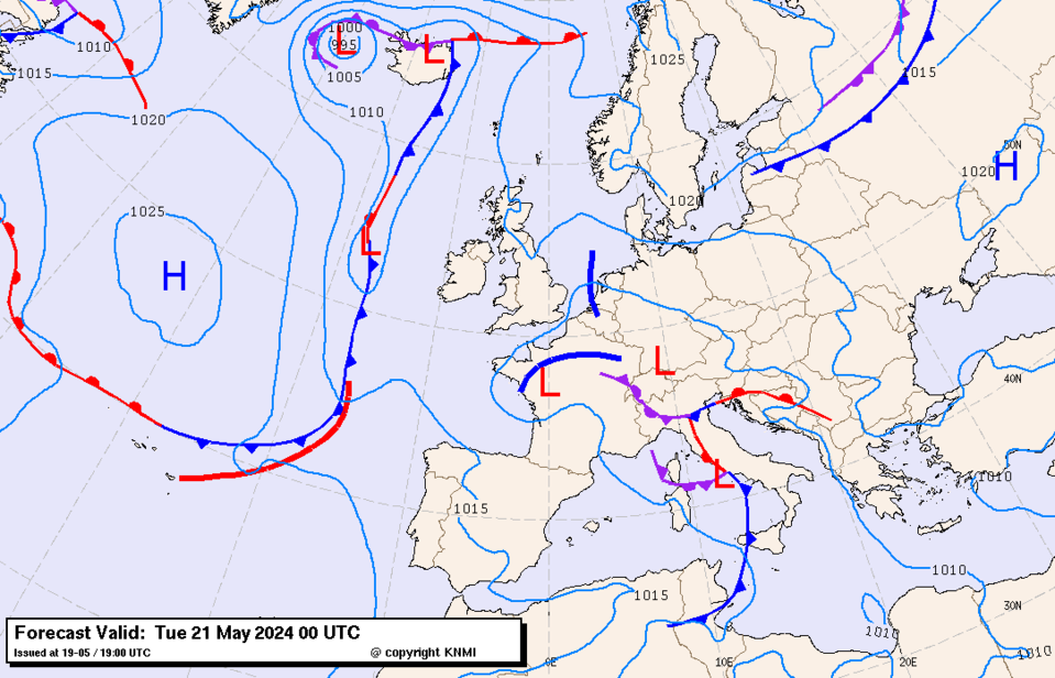 We bevinden ons in warme lucht. Een zwak koufront, herkenbaar aan stratus, trekt vanochtend zuid- en vervolgens zuidwestwaarts over ons aandachtsgebied. Een vlak lagedrukgebied boven Noord-Duitsland vult op. Het bijbehorende hoogtelaag, met een hoogtetrog aan de noordoostflank, trekt vandaag over Nederland zuidwestwaarts. In de middag hebben vooral het noorden en westen met de PVA van deze hoogtetrog te maken. Op de dagelijkse gang ontstaat er door land-zee contrasten weer een aantal subtiele vores boven ons land, het eerst boven het noorden en westen. Vanavond wordt aan de noordflank van een Frans laag een grootschaligere Z-N georiënteerde vore boven de oostelijke helft van het land dominant en wordt de stroming meer oostelijk. De vore trekt kantelend zuidwestwaarts en komt in de nacht naar dinsdag ZO-NW georiënteerd boven het zuidwesten van het land te liggen. Dinsdag overdag stroomt aan de flank van het Franse laag vanuit Duitsland warmere lucht binnen. Een uitdiepende randstoring vanuit Noord-Italië komt dinsdagavond boven het midden en zuiden van Duitsland te liggen. Een thermische vore vanuit dit Duitse laag bereikt in de loop van de middag het zuiden en trekt in de avond en in de nacht naar woensdag noordwaarts over ons land.
