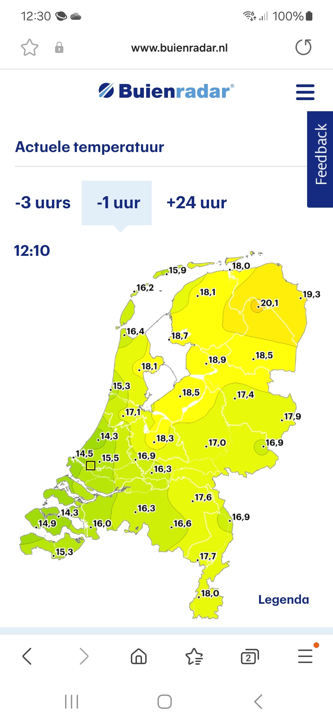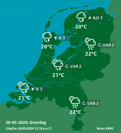 Vanmiddag is de zon geregeld te zien. Er ontstaan vooral in het westen en noorden enkele stevige regen- en onweersbuien, daarbij kan plaatselijk veel neerslag in korte tijd vallen. Ook is er kans op hagel. De maximumtemperatuur ligt rond 21°C. De wind komt uit een noord tot noordoostelijke richting en is zwak tot matig.