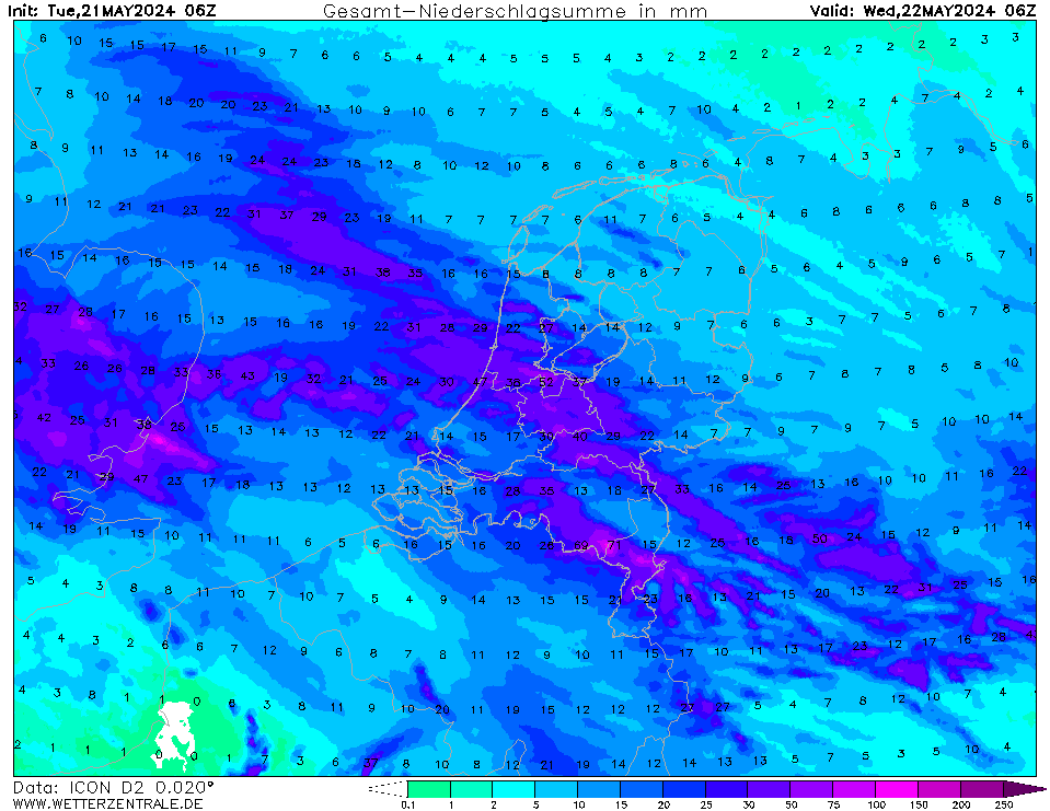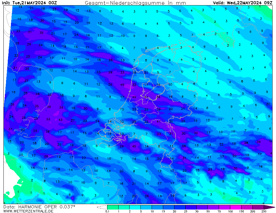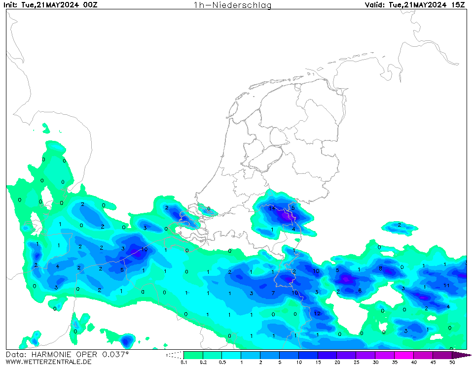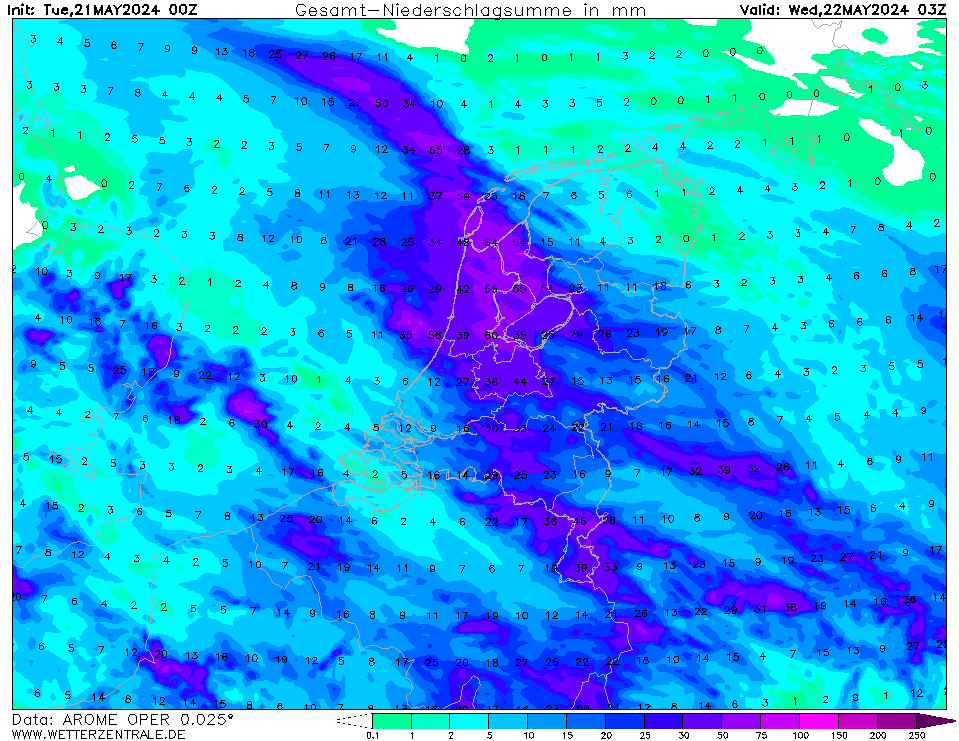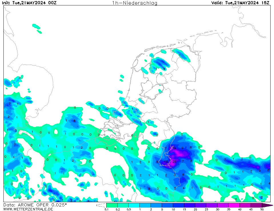 Als 3de Arome, Arome zit wat zuidelijker en laat bovengenoemde zwaarste buien boven omgeving Köln ontstaan die dan vooral Limburg aandoen. Arome ziet de buien iets later ontstaan, en deze komen na 17u Limburg binnen. Hier lijkt het net als bij ICON sterk op een groter onweerscomplex. Later ontwikkelen zich nog meer onweersbuien vooral over midden Nederland die richting het noordwesten trekken. Lokaal tot 70mm.