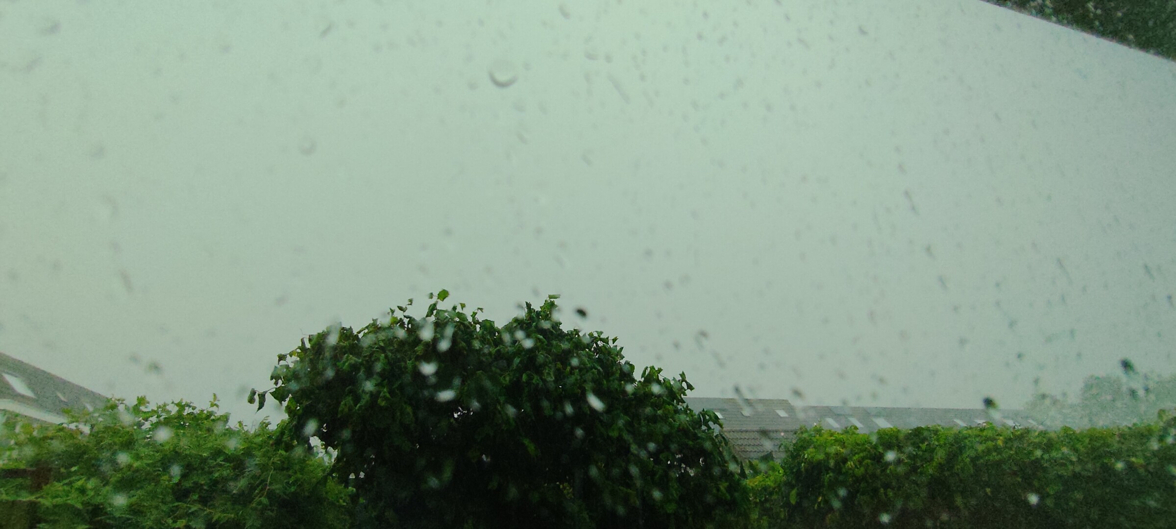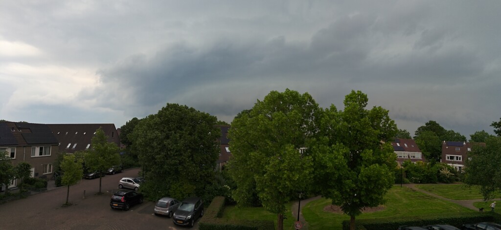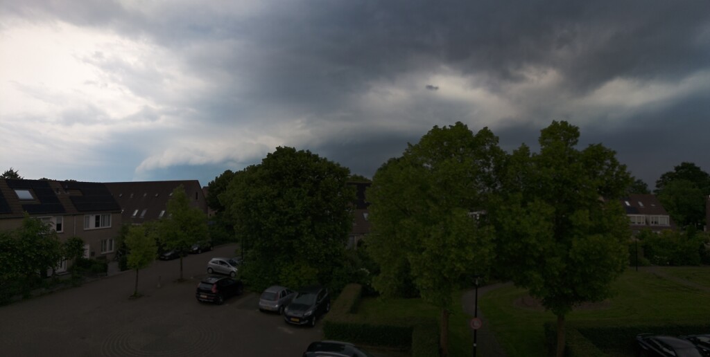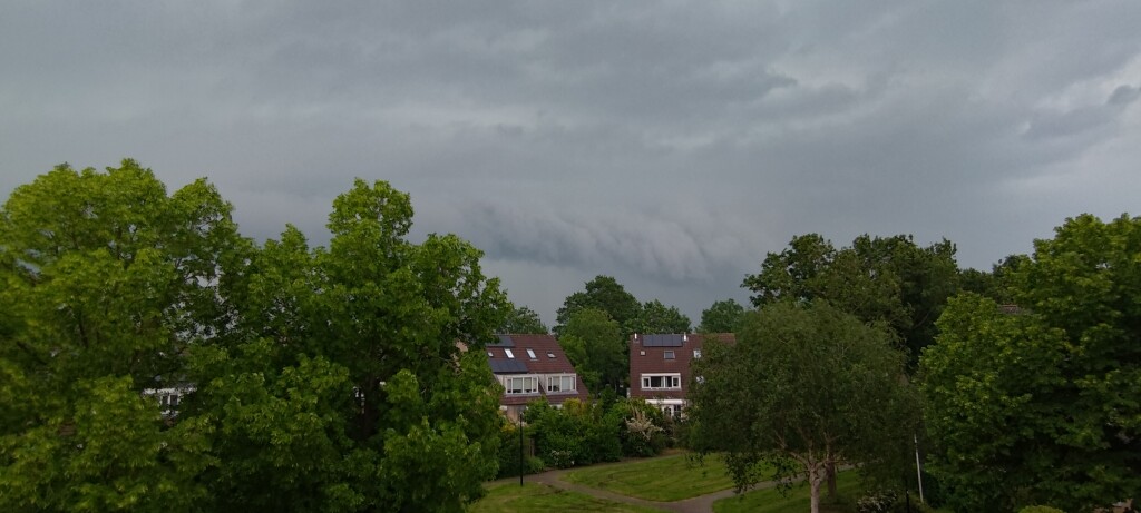 Ik denk dat dit een arcus is, want het oogde niet helemaal los van de bui zoals bij een rolwolk het geval is. Het is nu hier i.i.g. begonnen met plenzen na al een tijdje eerder wat dreigende gerommel te hebben gehoord.