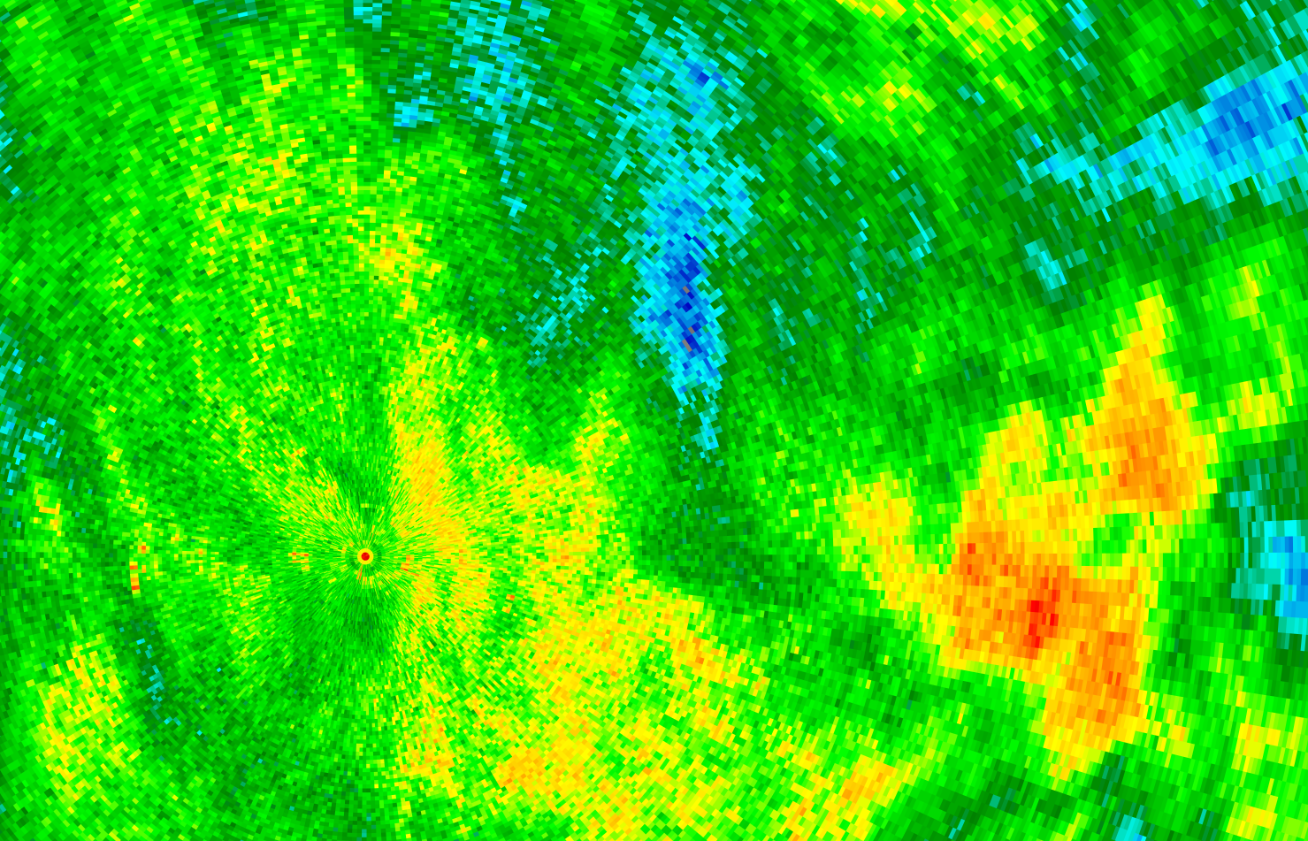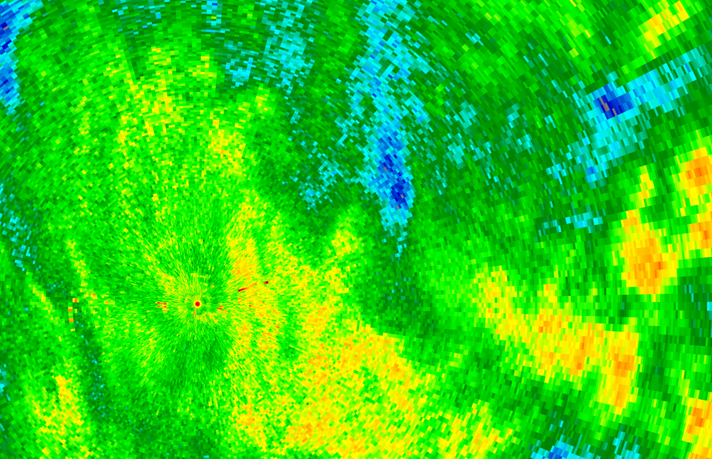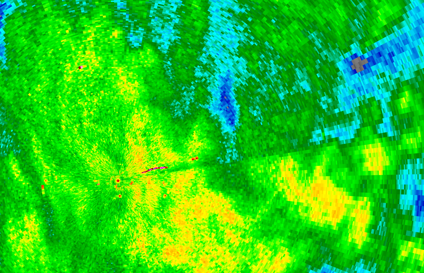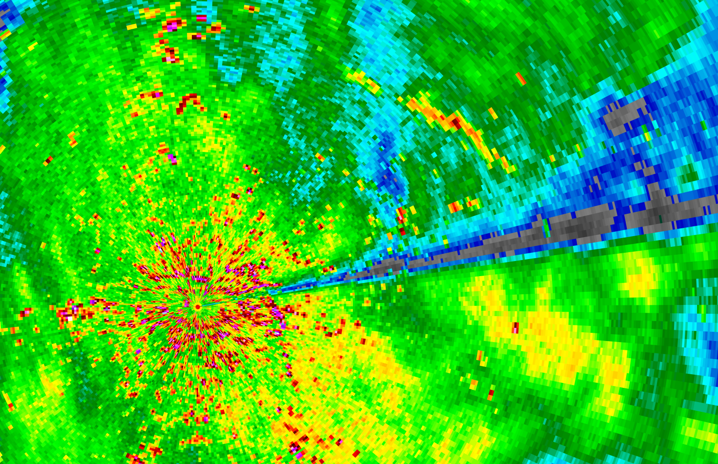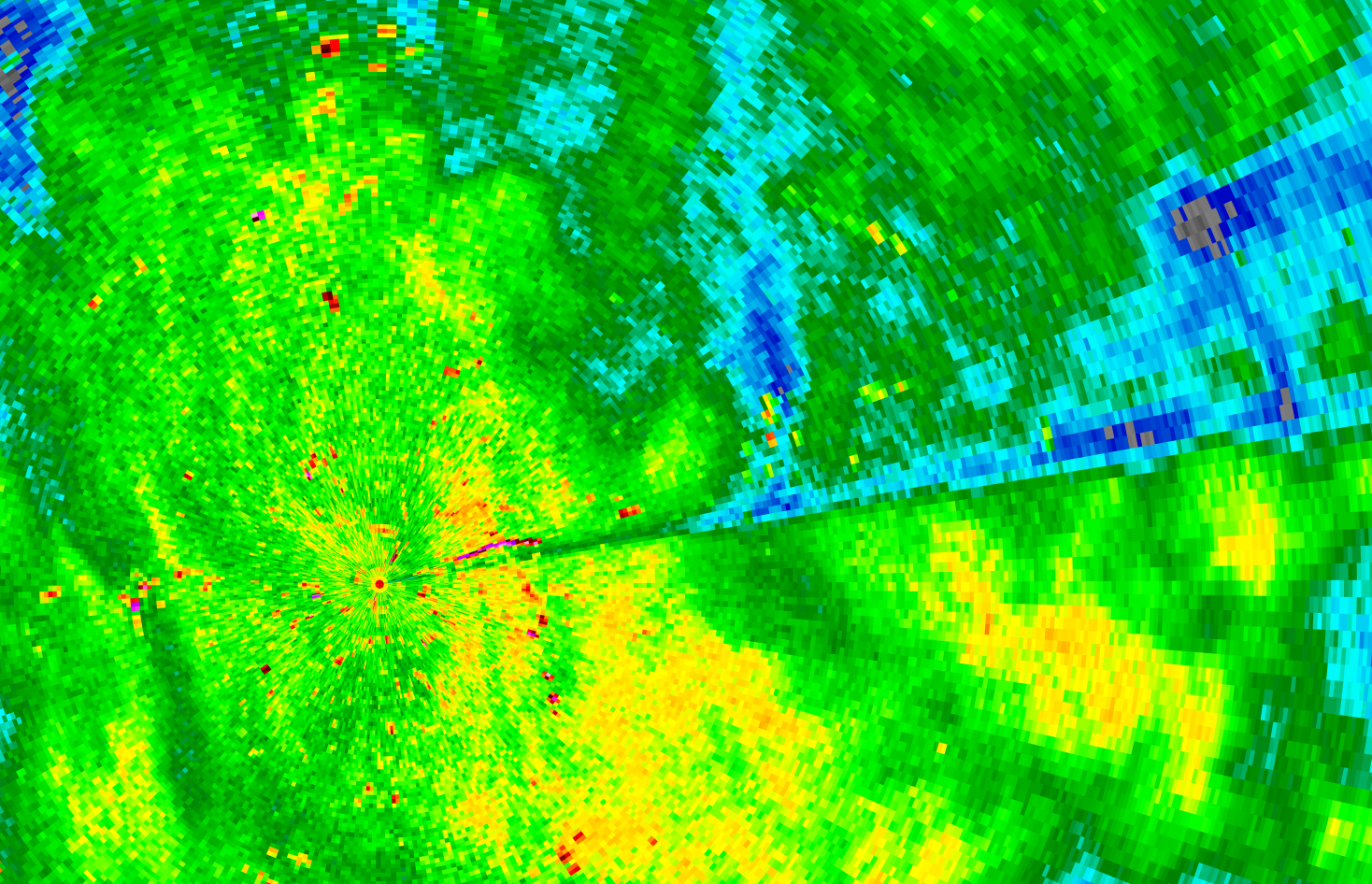 Zijn de oorzaak denk ik. Op de 0.3, 0.8, 1.2, 2.0 en 2.8° radarscans van 14:15 is een sterk reflecterende lijn te zien die overeenkomt met de positie van het windmolenpark. Vooral aan de zuidkant is de verzwakking van het neerslagsignaal sterk (30 dBZ) bij de laagste scanhoek, maar ook ten noorden ervan is er sprake van signaalverlies (10-20 dBZ). De schaduw verdwijnt pas wanneer de windmolens niet meer te zien zijn op de radar (zie de laatste radarscan met scanhoek 2.8° ).