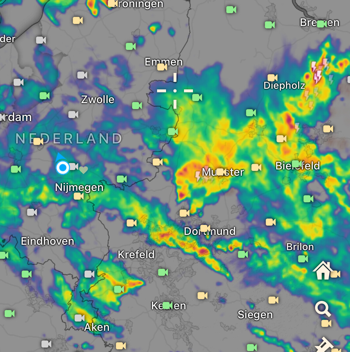 Dat lijkt inderdaad wel te gebeuren ja, de buien trekken nu langzaam naar elkaar toe om uiteindelijk waarschijnlijk een gesloten geheel te vormen. Maar wat je zegt, het zal wel weer inkakken…