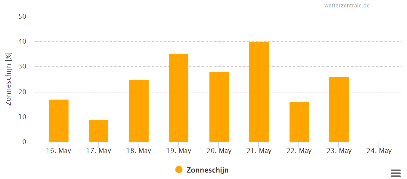 Sinds 16 mei is het hier gewoon erg somber met slechts 31,2 zonuren in Deelen, wat neerkomt op 24,5% van de maximaal mogelijke tijd. Gisteren zelfs exact 0,0 zonuren. Hier de zonpercentages per dag (% van de daglichtperiode) in Deelen:
