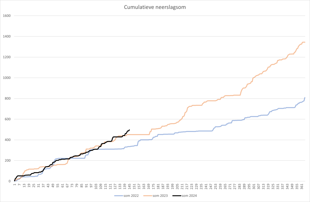 De extreem natte periode sinds 11 oktober vorig jaar (dat was hier heel duidelijk het begin van de nattigheid) is nog altijd niet ten einde gekomen. En het stopt voorlopig ook nog niet. Momenteel is de neerslagsom (tot 25 mei) hoger dan in recordjaar 2023. Maar toen viel er natuurlijk heel veel in de tweede helft van het jaar. De voorsprong zal de komende weken verder oplopen want in dezelfde periode vorig jaar was het wekenlang droog.