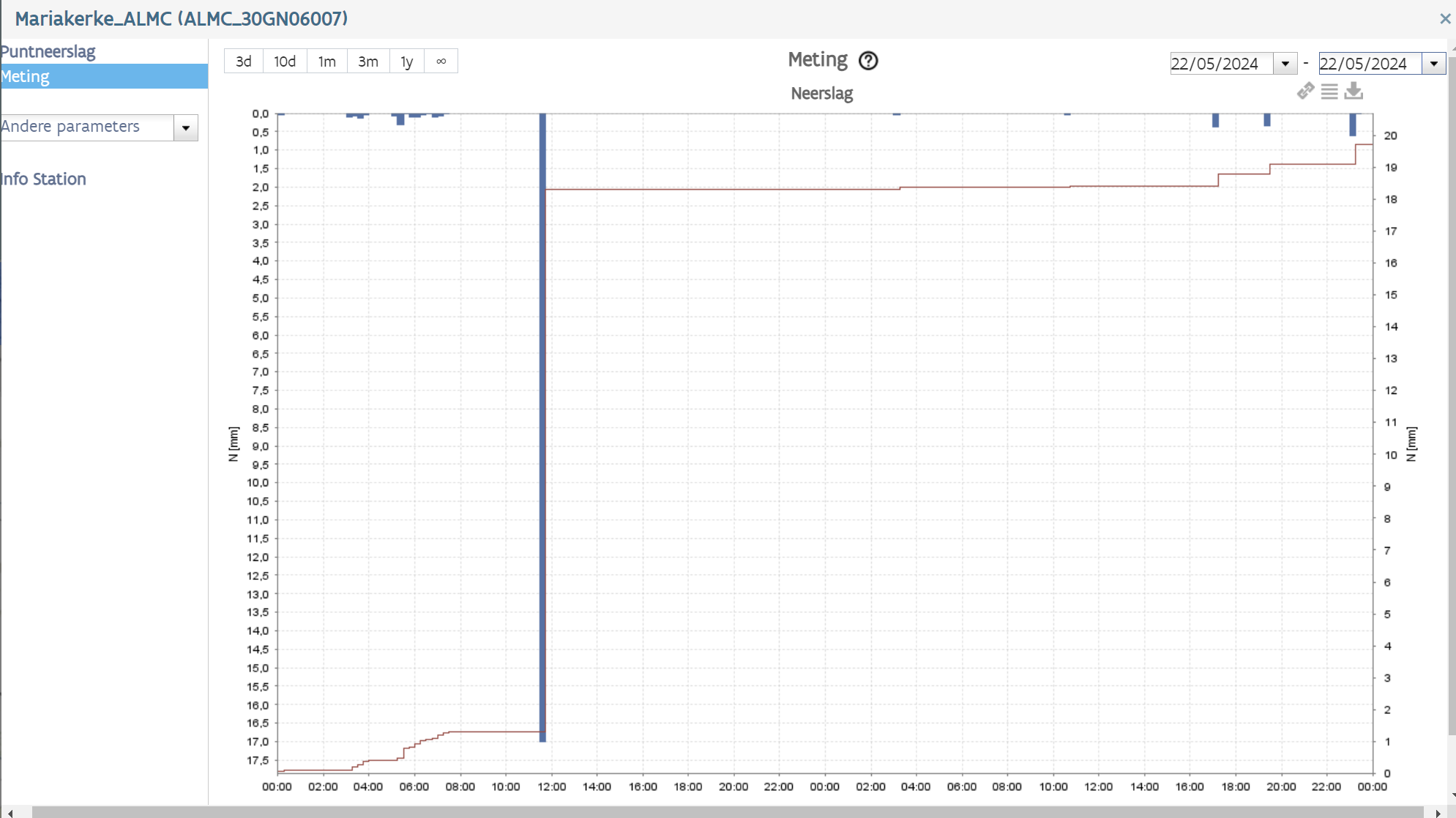 Afgelopen woensdagmiddag zou er 17mm gevallen in een kwartier tijd, de grootste piek deze maand. Maar woensdag was een mooie dag, ook archief buienradar toont niks. Dat is dus een behoorlijke afwijking. Mogelijk grappenmakers die water over de omheining gekieperd hebben?