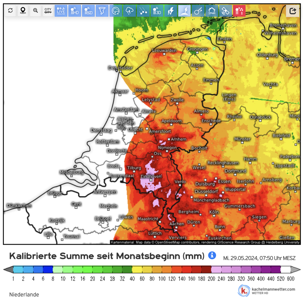 Tijdens dit soort maanden geeft het KNMI-overzicht een prima beeld, maar het is niet nauwkeurig genoeg om alles zichtbaar te maken. De gekalibreerde radartotalen worden bij KNMI helaas niet per maand weergegeven, alleen per dag en ze lopen ook altijd een paar dagen achter: https://www.knmi.nl/nederland-nu/klimatologie/geografische-overzichten/radar. Bij Kachelmann kan het wel per maand, maar die dekt maar een deel van Nederland.