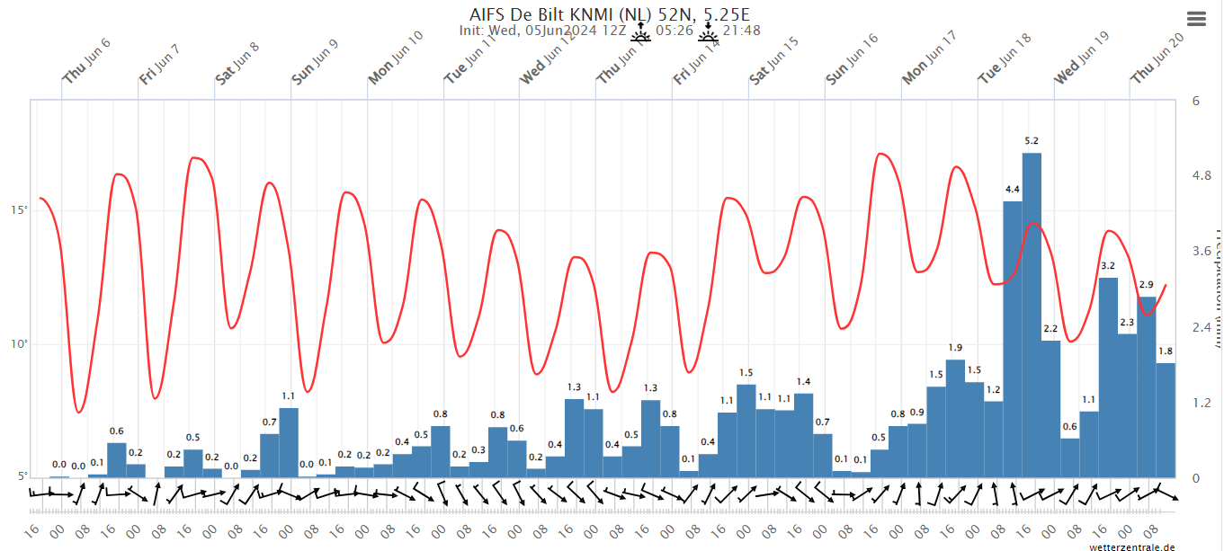 AIFS; t/m 2e decade juni geen warme dagen. Toenemend onstabiel ook