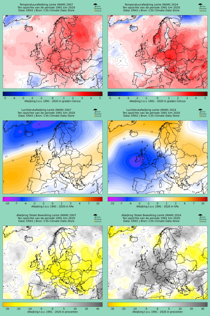 Landelijk was de lente van 2024 (nipt) recordwarm op basis van de seizoensgemiddelde temperatuur. Het grootschalige patroon was echter precies omgekeerd t.o.v. dat in 2007, de vorige recordhouder. Hetzelfde geldt voor het aantal zonuren. Mede daarom zeer opmerkelijk dat het toch de warmste lente ooit gemeten is geworden.