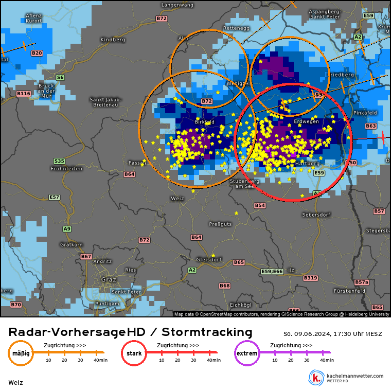 Het voorval vond plaats bij Hartberg, in het rood omlijnde gebied. Even later werd die cel als paars weergegeven. Dus heeft men nog wel wat te onderzoeken, namelijk wat hier fout is gegaan.