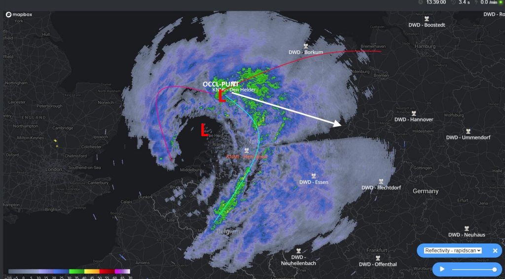 Kerndruk nu rond de 1001hPa, zowel De Kooy als op zee. Rondom het laagje opklaringen. Occlussiepunt in NH nu. Schuift over het noorden vandaag oostwaarts. Gaat veel regen vallen daar!