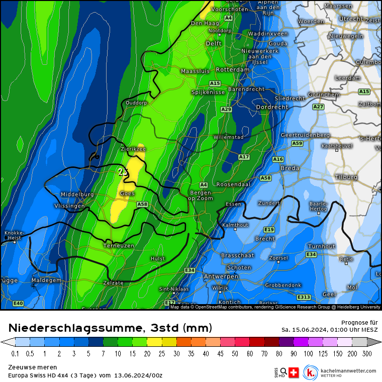 Dat zijn de neerslagsommen tijdens het evenement neem ik aan. Maar bij het eind en net daarna wordt de zwaarste bui verwacht. De nieuwe Swiss-HD geeft wel een mooie oplossing: over Tholen valt er bijna niks! Maar daar kun je natuurlijk niet van uitgaan. En er blijft het punt van de windstoten aan de rand van dit buiencomplex, mogelijk tot 70 km/u. Er is zelfs een kans dat dat voor 23 uur al gebeurt. Je zou iets eerder kunnen stoppen, maar lost dat de zaak op? Dat is nog maar de vraag.