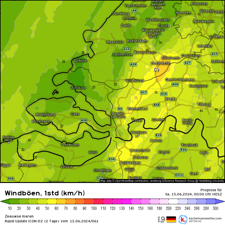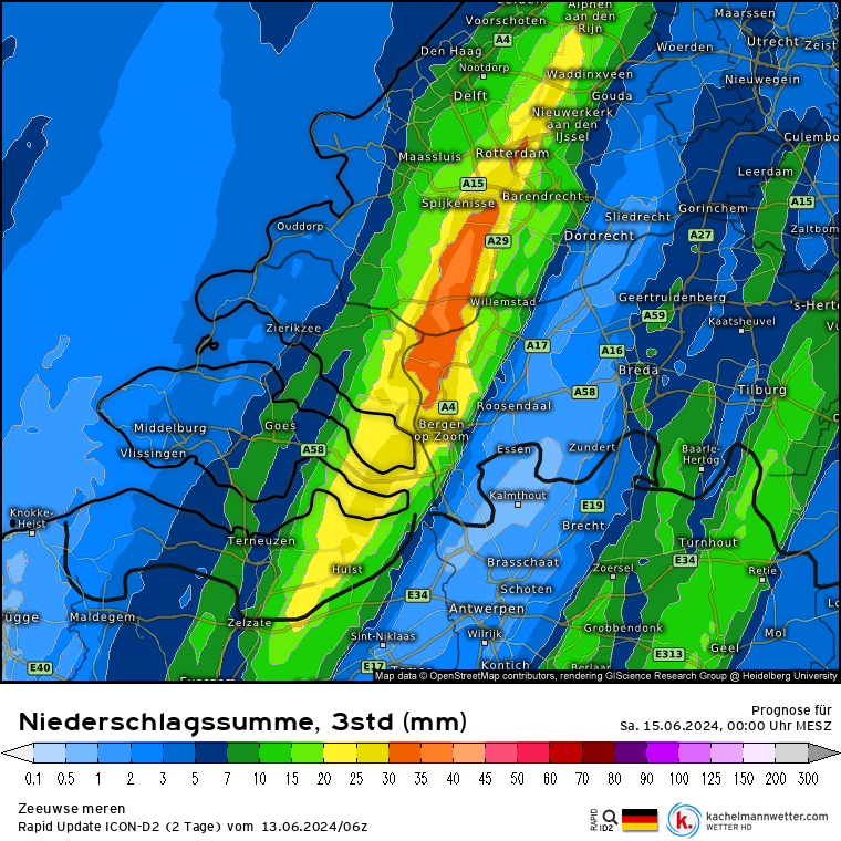 De neerslagkaart geeft de verwachte 3-uurssom tussen 23 en 02 uur. Het zal misschien een uitschieter zijn, maar ja...