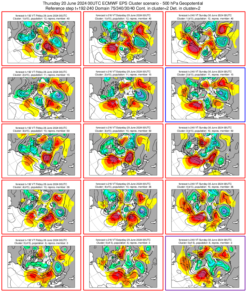 De laatste twee clusters zijn de clusters waarbij het zachte weer de overhand blijft hebben. Dit zijn 18/50 leden = 36% ongeveer. Bij de eerste drie clusters nadert een trog onze omgeving en verkiest de wind geleidelijk een ZW stroming, timing wel niet overal gelijk. Uiteindelijk zijn wel nog veel opties mogelijk en ik vermoed dat er ook bij cluster 2/3 enkele warme opties zullen blijven
