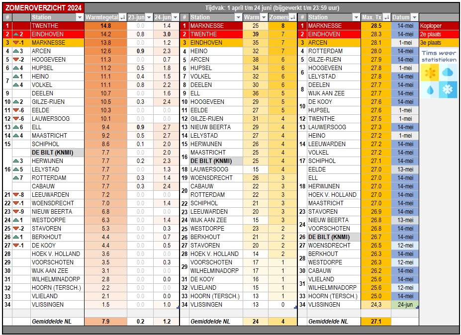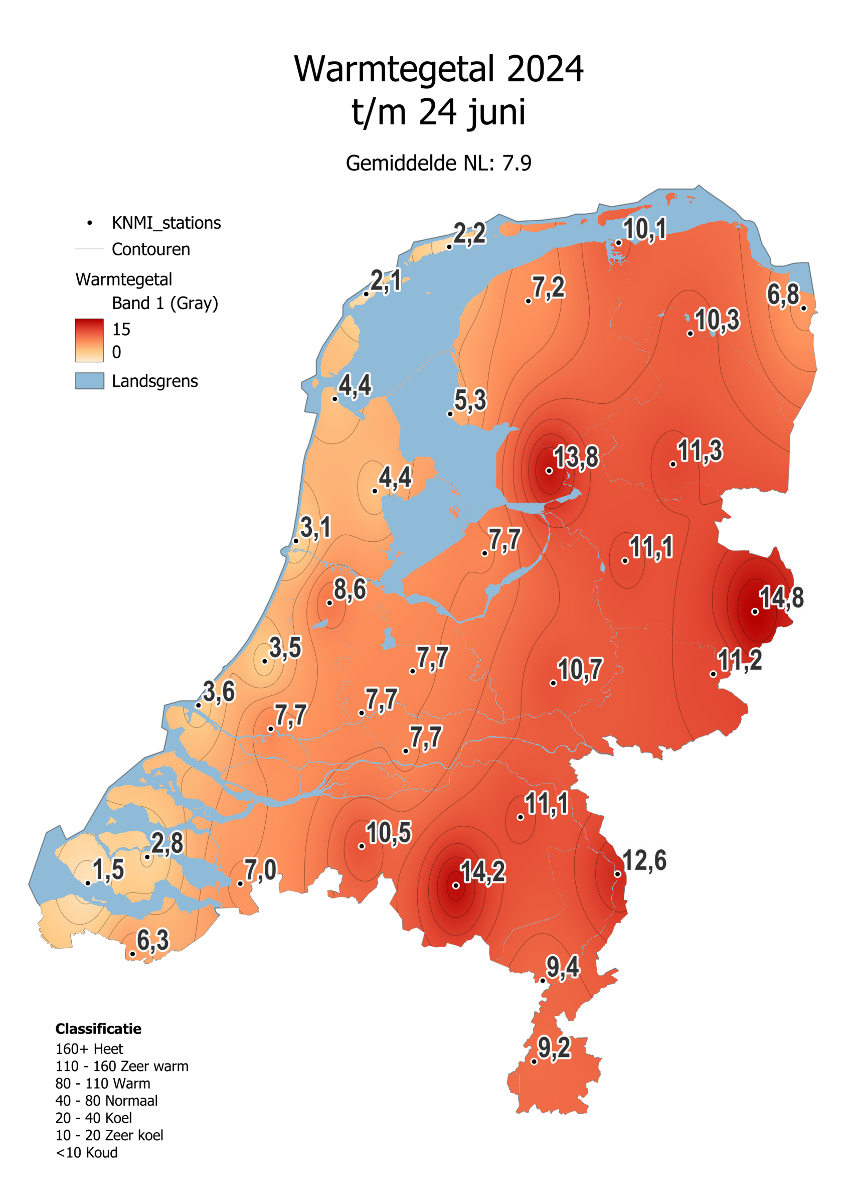 Het gemiddelde warmtegetal in Nederland ligt op 7,9 en De Bilt scoort 7,7 punten. Aan kop gaat Twenthe met respectievelijk 14,8. Eindhoven (2e) noteerde gisteren het hoogste daggemiddelde met 21,0°C (warmtegetal = 3,0). Opvallend is het station Marknesse dat met 8 zomerse dagen en de hoogste maxima van 28,5°C nog altijd aan de leiding gaat. Aan het tweede zal vandaag ongetwijfeld een einde komen, want in het zuidoosten wordt het vandaag 29+ graden.