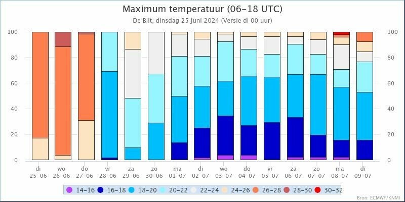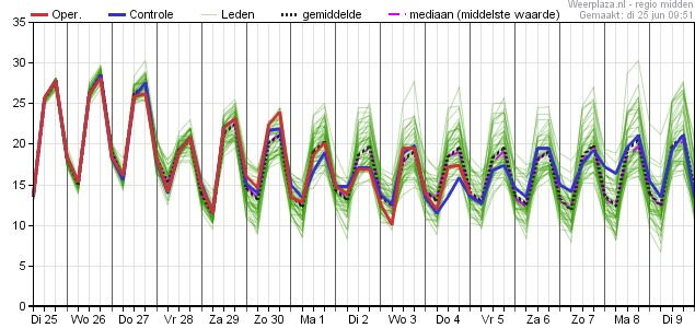 Bovendien zou ik uit de grafiek voor vrijdag een verwachtingswaarde van iets onder de 20°C afleiden, maar de pluim geeft een graad hoger. Kloppen de temperatuurintervallen wel met de gebruikte kleuren? Want die verlopen voordtdurend naarmate de normaal verandert.