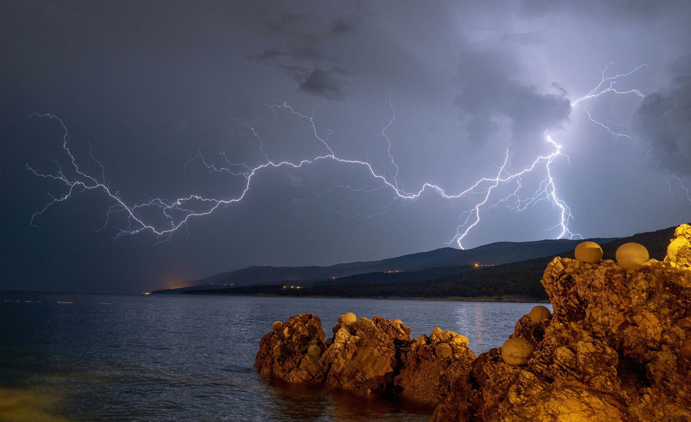 Ik zit even een weekje met mijn gezin in Rabac in Kroatië. Gisteravond ontstonden zuidelijk van mij op zee enkele stevige onweersbuien, die langzaam maar zeker noordwaarts trokken. De bijbehorende bliksemontladingen bleven veelal ver weg en ik wilde al zittend op de boulevard hier de moed al bijna opgeven, totdat iets ten noorden van mij een fel buitje ontstond die binnen drie minuten een paar mooie 'takjes' produceerde. Bij deze hieronder de mooiste wat mij betreft.