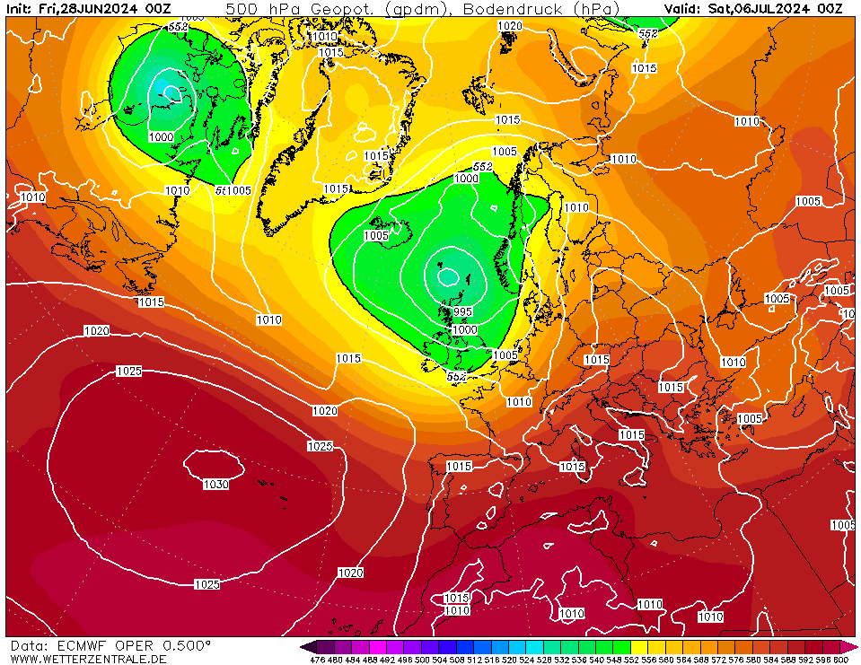 EC Oper laat ook zien dat het de kant lijkt op te draaien van dominante depressies. De hogedruk in het hoge noorden dwingt de lagen om richting onze regionen te trekken. Alleen een krachtige uitloper kan hier een eind aan maken. Zo krachtig dat de depressies als het waren platgedrukt worden tussen twee hogen en er een samensmelting plaatsvindt. Zo ver is het nog lang niet. Maar geen hitte meer tot medio juli vind ik te boud. Het kan zo maar binnen enkele runs goed gaan vallen. Genoeg leden opteren namelijk wel voor een scenario waarbij de lagen buitenspel worden gezet. In de jongste run van EC lukt dit niet. Maar heel slecht oogt ie ook niet met een zwakke WC voorzien van aardige T850’s.