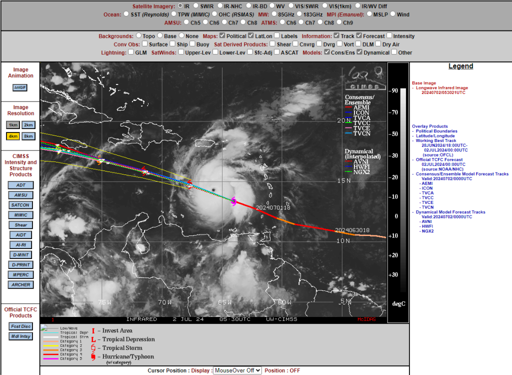 000 WTNT32 KNHC 020549 TCPAT2 BULLETIN Hurricane Beryl Intermediate Advisory Number 14A NWS National Hurricane Center Miami FL AL022024 200 AM AST Tue Jul 02 2024 ...CATEGORY 5 BERYL STILL INTENSIFYING IN THE SOUTHEASTERN CARIBBEAN... ...EXPECTED TO BRING LIFE-THREATENING WINDS AND STORM SURGE TO JAMAICA LATER THIS WEEK... SUMMARY OF 200 AM AST...0600 UTC...INFORMATION ---------------------------------------------- LOCATION...14.2N 65.8W ABOUT 445 MI...715 KM ESE OF ISLA BEATA DOMINICAN REPUBLIC ABOUT 775 MI...1245 KM ESE OF KINGSTON JAMAICA MAXIMUM SUSTAINED WINDS...165 MPH...270 KM/H PRESENT MOVEMENT...WNW OR 290 DEGREES AT 22 MPH...35 KM/H MINIMUM CENTRAL PRESSURE...935 MB...27.61 INCHES