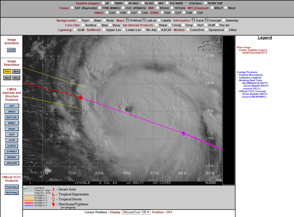 000 WTNT32 KNHC 021149 TCPAT2 BULLETIN Hurricane Beryl Intermediate Advisory Number 15A NWS National Hurricane Center Miami FL AL022024 800 AM AST Tue Jul 02 2024 ...BERYL EXPECTED TO BRING LIFE-THREATENING WINDS AND STORM SURGE TO JAMAICA ON WEDNESDAY... ...HURRICANE HUNTER AIRCRAFT REPORT LITTLE CHANGE IN STRENGTH OVER THE PAST FEW HOURS... SUMMARY OF 800 AM AST...1200 UTC...INFORMATION ---------------------------------------------- LOCATION...15.0N 67.9W ABOUT 300 MI...485 KM SE OF ISLA BEATA DOMINICAN REPUBLIC ABOUT 625 MI...1005 KM ESE OF KINGSTON JAMAICA MAXIMUM SUSTAINED WINDS...165 MPH...270 KM/H PRESENT MOVEMENT...WNW OR 290 DEGREES AT 22 MPH...35 KM/H MINIMUM CENTRAL PRESSURE...934 MB...27.58 INCHES