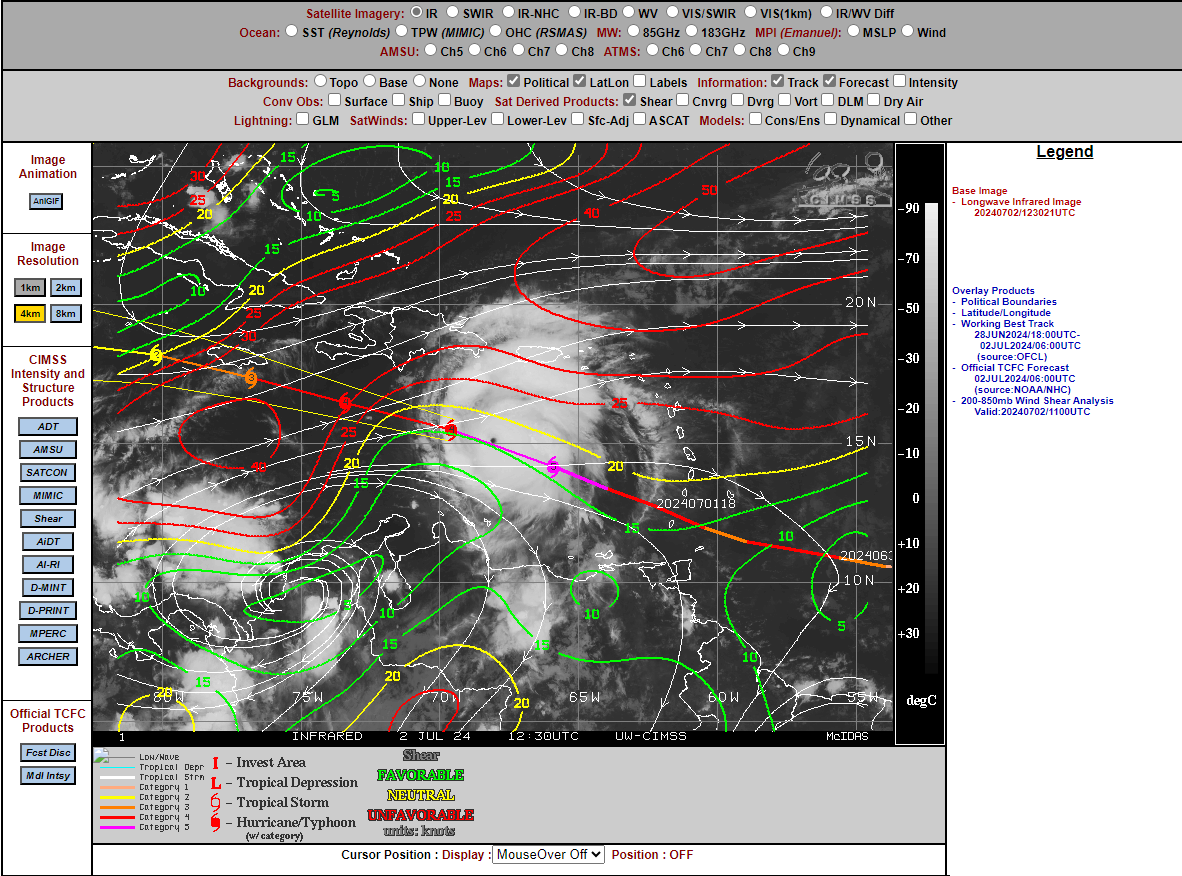 Ik denk wel dat hij nu ongeveer op z'n piek is. De wind shear gaat toenemen en dat zou hem moeten verzwakken.